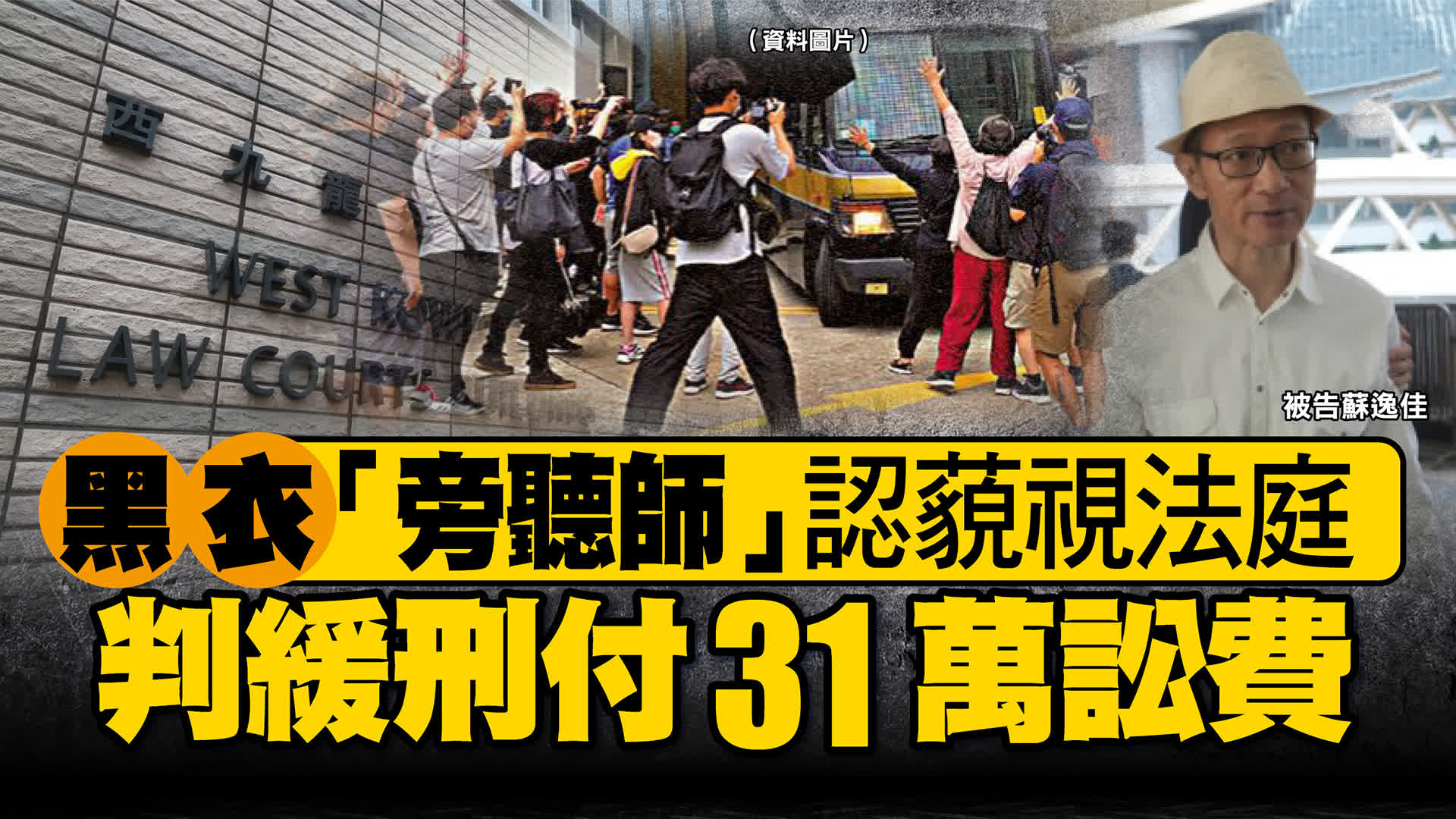 大公文匯全媒體報道,已被政府解僱的工業貿易署貿易主任蘇逸佳,充當黑暴案「旁聽師」,涉於2021年12月旁聽涉及國安和黑暴案聆訊時,四度作出擾亂法庭秩序的行為,包括戴帽及穿印有政治標誌的衣物進入法庭。律政司首度對這類藐視法庭行為採取檢控行動,被告昨日在高等法院承認藐視法庭罪,被判監禁2個月,但緩刑2年,並須向律政司支付31萬元懲罰性訟費。