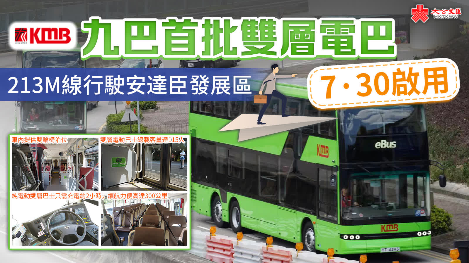 目前九巴擁有近80部純電動巴士,為全港最大規模新能源巴士車隊。首部純電動雙層巴士路線213M將於7月30日起,率先行走安達臣發展區。與早前已投入服務的單層電巴一樣,該巴士以「電光綠」作為車身主色,雙層電動巴士總載客量達115人,只需充電約2小時,續航力便高達300公里,足以應付九巴近八成巴士的全日運作需要。