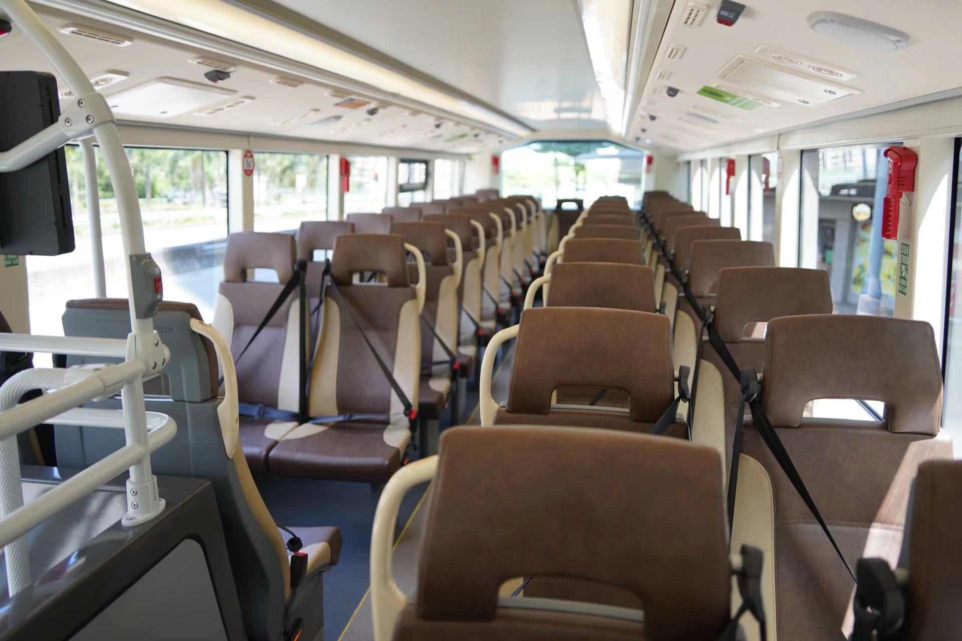 九巴雙層電巴達「零排放」標準,更增設多項環保設施,包括車廂以LED燈為乘客照明,車頂亦設太陽能板,可供電予巴士乘客設施。最新雙層電巴與現役雙層巴士的車廂布局類同,乘客座位距離和通道更寛闊;車內亦提供雙輪椅泊位,配合全車座位安全帶、電子穩定系統及駕駛監察系統等先進安全設備,令乘客享受環保、舒適、寧靜和安全的巴士旅程。此外,雙層電巴配備九巴最新的巴士設施規格,包括提供免費5G WiFi上網服務,車廂亦設置USB充電插座。