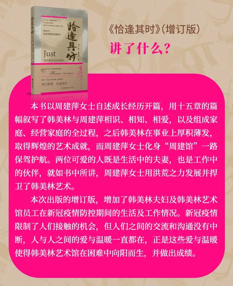 2022年,四地韓美林藝術館總館長周建萍撰寫了《恰逢其時》,書籍一經推出,在社會上獲得了巨大反響。應廣大書迷朋友的要求,華文出版社特此推出《恰逢其時》增訂版。