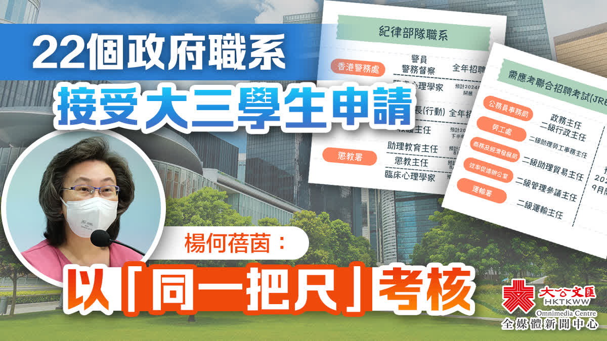 楊何蓓茵又說,當局會繼續在暑假及開學後,加強新措施的宣傳推廣工作,希望吸納更多有志之士加入政府服務。她重申,會秉持公務員招聘的公開、公平及公正原則,以「同一把尺」考核大學三年級的學生和其他申請人,不存在降低要求。