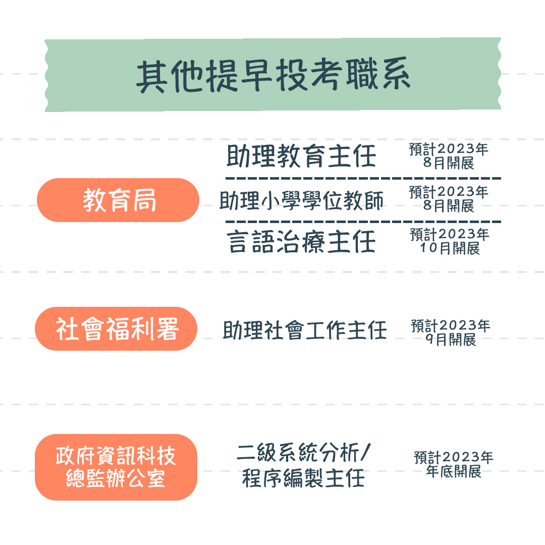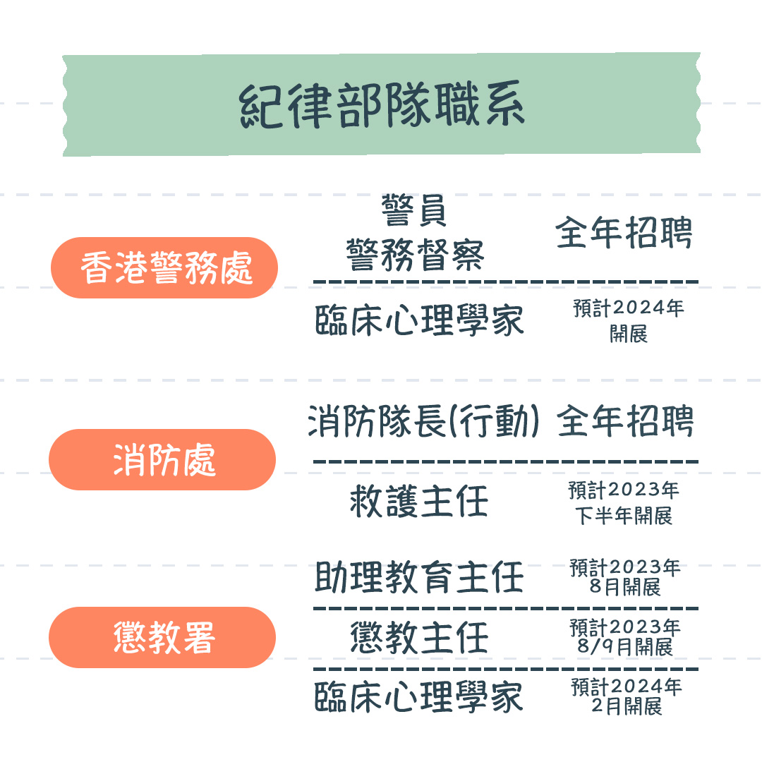 楊何蓓茵指出,當局8月會進行助理教育主任及助理小學學位教師的招聘,9月會開放接受申請的聯合招聘考試 (JRE),涉及6個職系,包括政務主任、二級行政主任、二級助理勞工事務主任、二級助理貿易主任、二級管理參議主任及二級運輸主任;多個紀律部隊亦響應及配合新安排,開放招收多個職系。