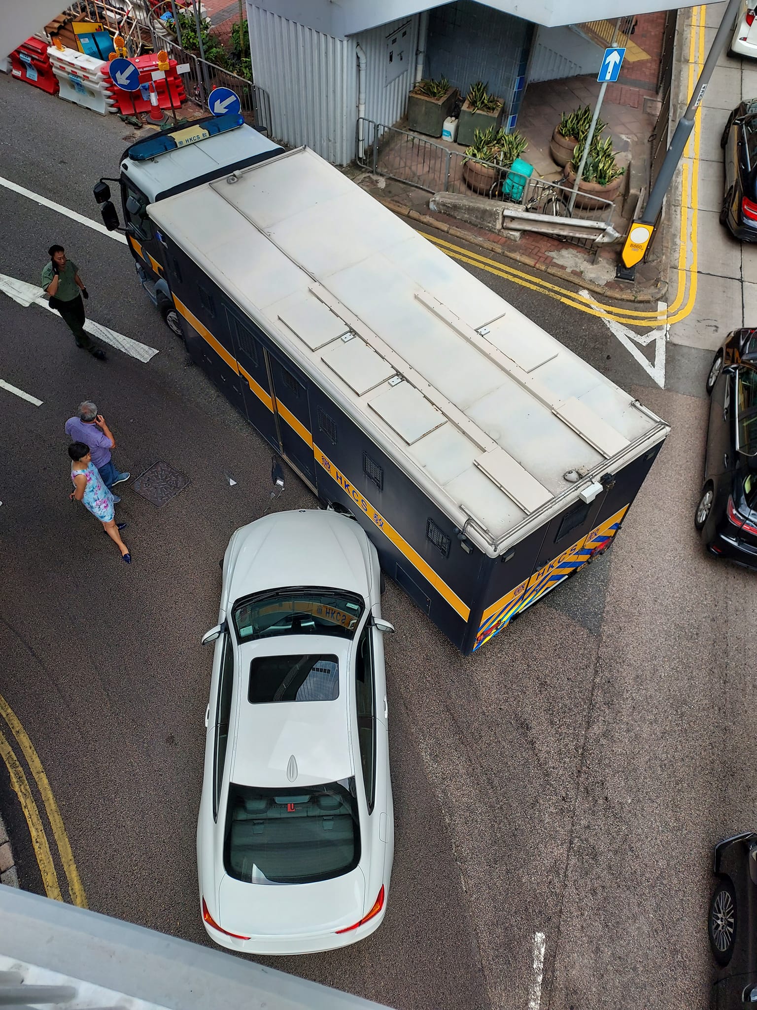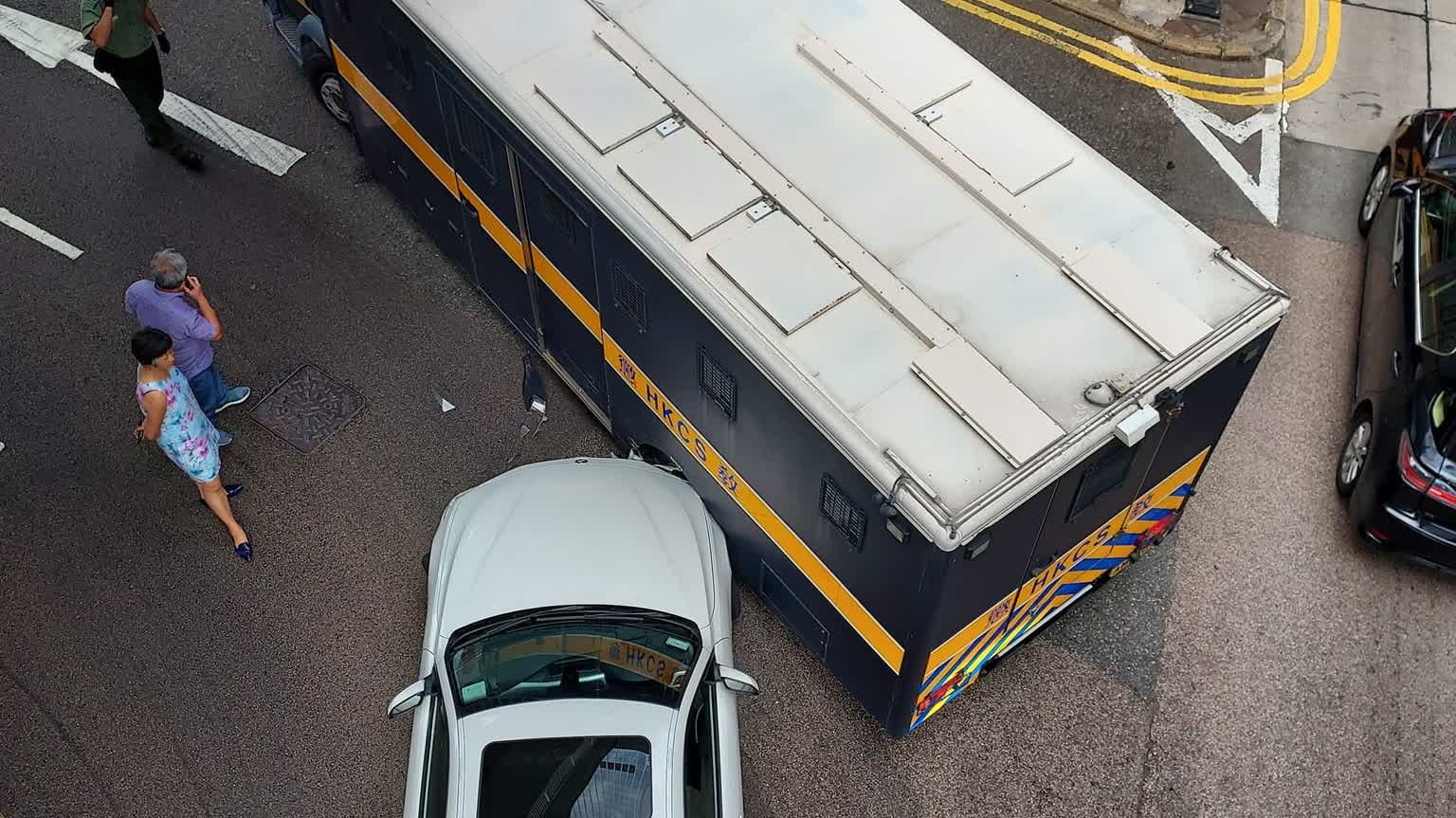 事發於今日(28日)下午3時許,一輛白色私家車沿金鐘道行駛,準備轉入軍器廠街時,與懲教署一輛囚車相撞。私家車車頭損毀,地面散落碎片,囚車車身亦遺下花痕。據現場消息指,囚車當時載有犯人,需由另一輛囚車接載離開。