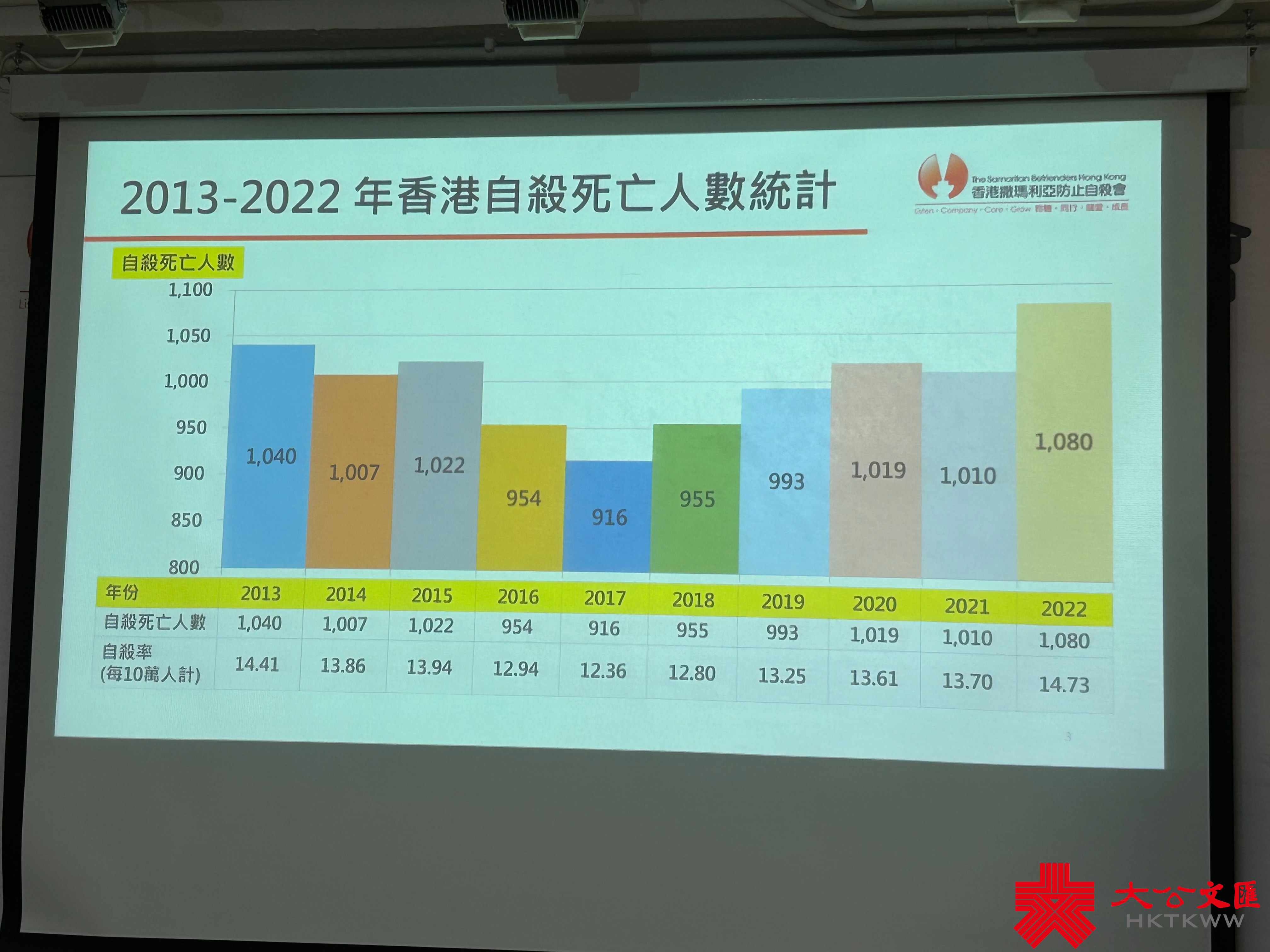 數據顯示,2022年,本港共有1080宗自殺死亡個案,自殺率為14.73,即每十萬人中有14.73人自殺身亡,平均每日約有2.96人自殺死亡。相比2021年自殺死亡人數的1010宗(自殺率為13.70),2022年的自殺死亡人數上升了70宗,自殺率上升了1.03。