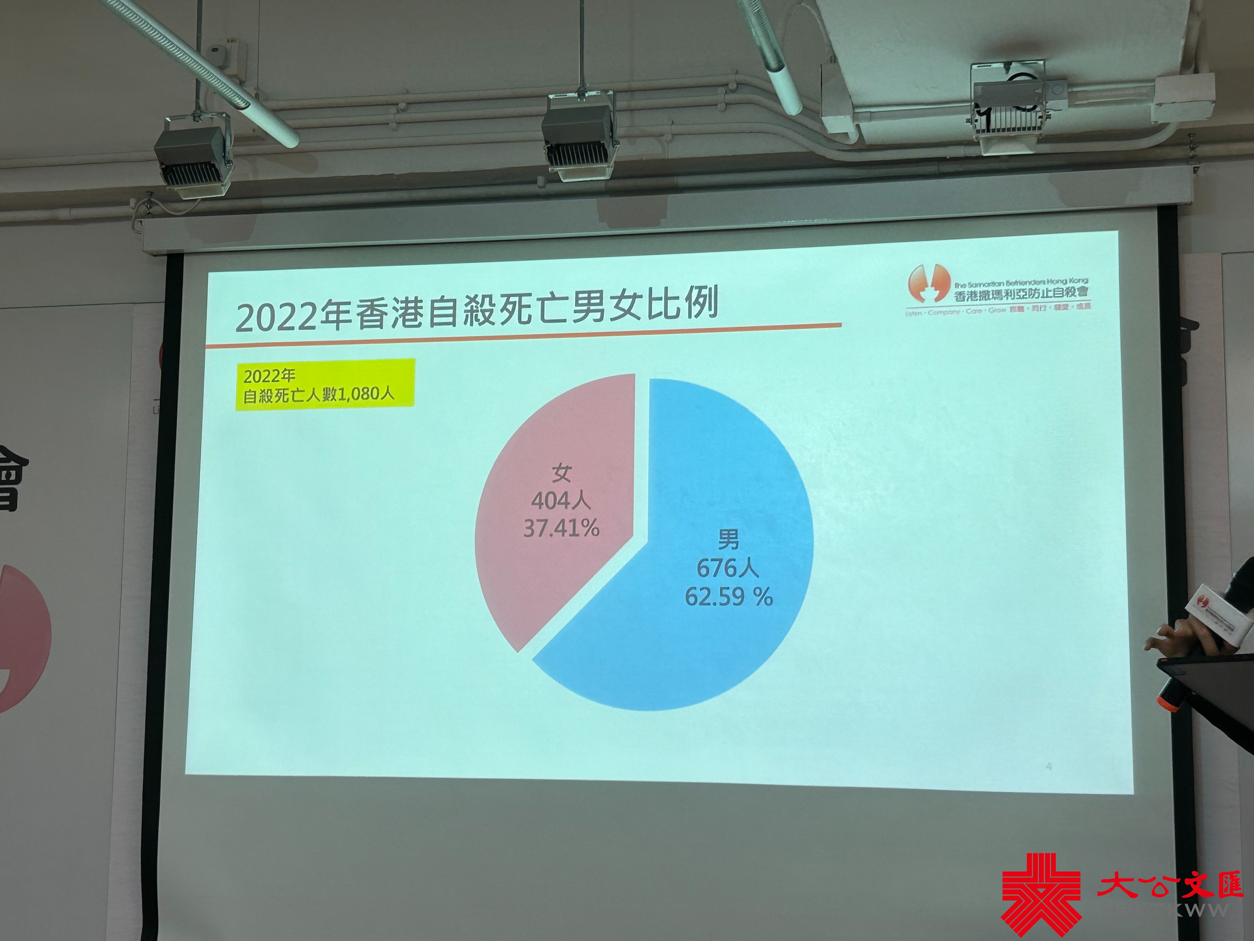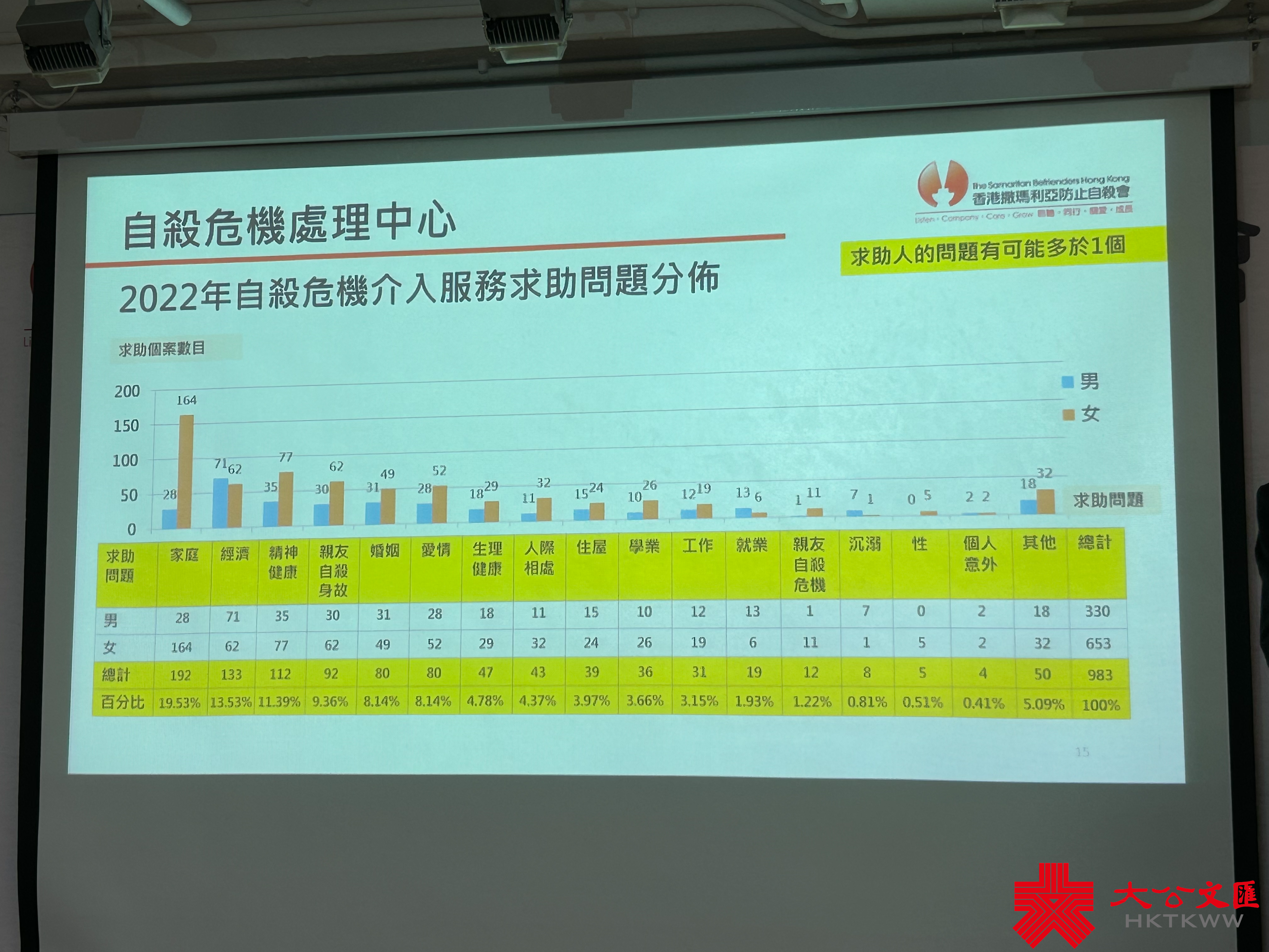 (大公文匯全媒體記者 嚴璐瑶)香港撒瑪利亞防止自殺會今日(29日)舉行記者會,就死因裁判法庭之數據進行分析、發布2022年全港自殺死亡統計數據及該會各類防止自殺服務數字。