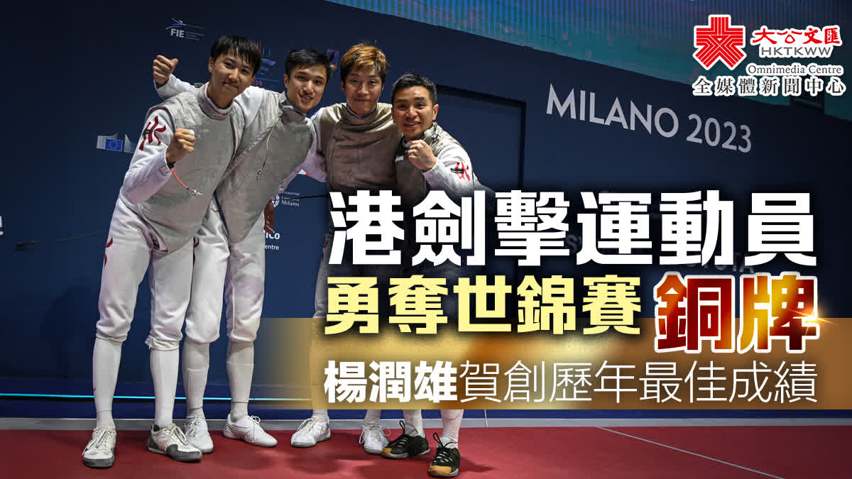 大公文匯全媒體報道,在意大利舉行的世界劍擊錦標賽,由張家朗、蔡俊彥、楊子加和梁千雨組成的香港男子花劍隊取得銅牌,是港隊在世錦賽歷來最好成績。