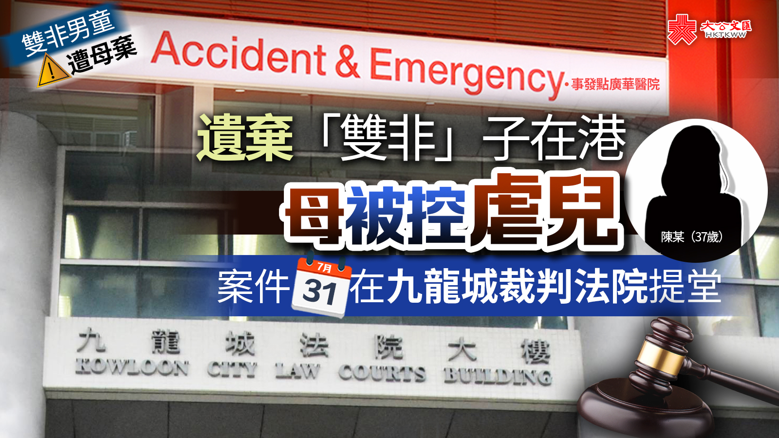 (大公報記者 葉浩源)本月21日,12歲「雙非」男童陳泓儒被母親遺棄在廣華醫院,事後陳母稱願意來港接回兒子。據悉,她前日(29日)乘坐高鐵抵港,在西九龍站被警方拘捕。她被暫控一項對所看管兒童或少年人虐待或忽略罪,案件今日在九龍城裁判法院提堂。陳泓儒目前繼續由社會福利署屯門兒童及青少年院照顧,直至其福利安排有裁決,他的身體及精神健康俱無礙。