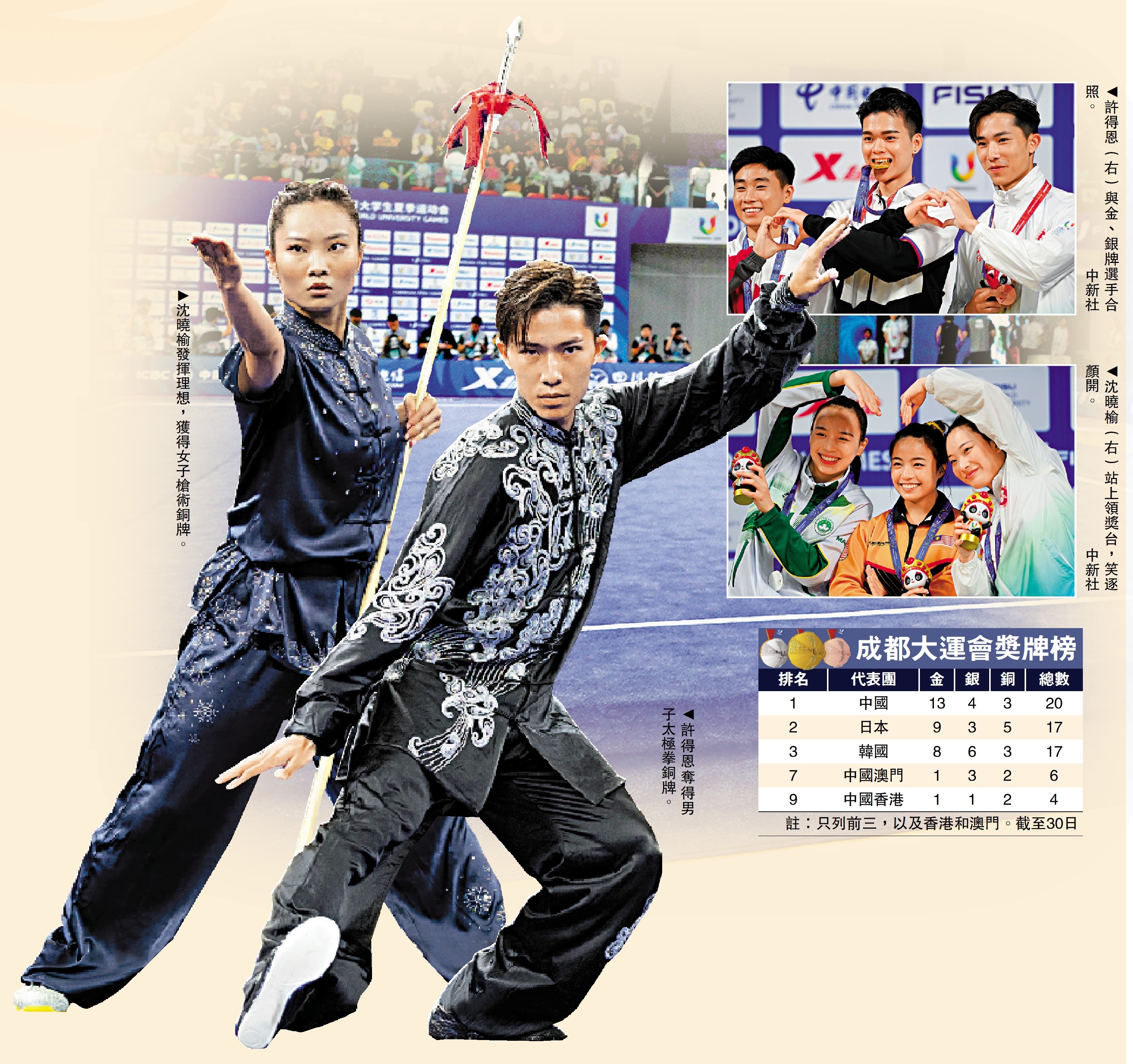 (大公報記者 向芸)中國香港體育代表團昨天在成都大運會憑着武術隊續有不俗的表現,於獎牌榜上加添兩銅。前天為港隊奪得首金的許得恩,昨在男子太極拳以9.660分獲得季軍;隊友沈曉榆則於女子槍術以9.583分收穫季軍,港隊暫在獎牌榜以1金1銀2銅位列第9。兩天內勇摘1金1銅的許得恩,已經穩獲「賽馬會優秀運動員獎勵計劃」合共60萬元的獎金。