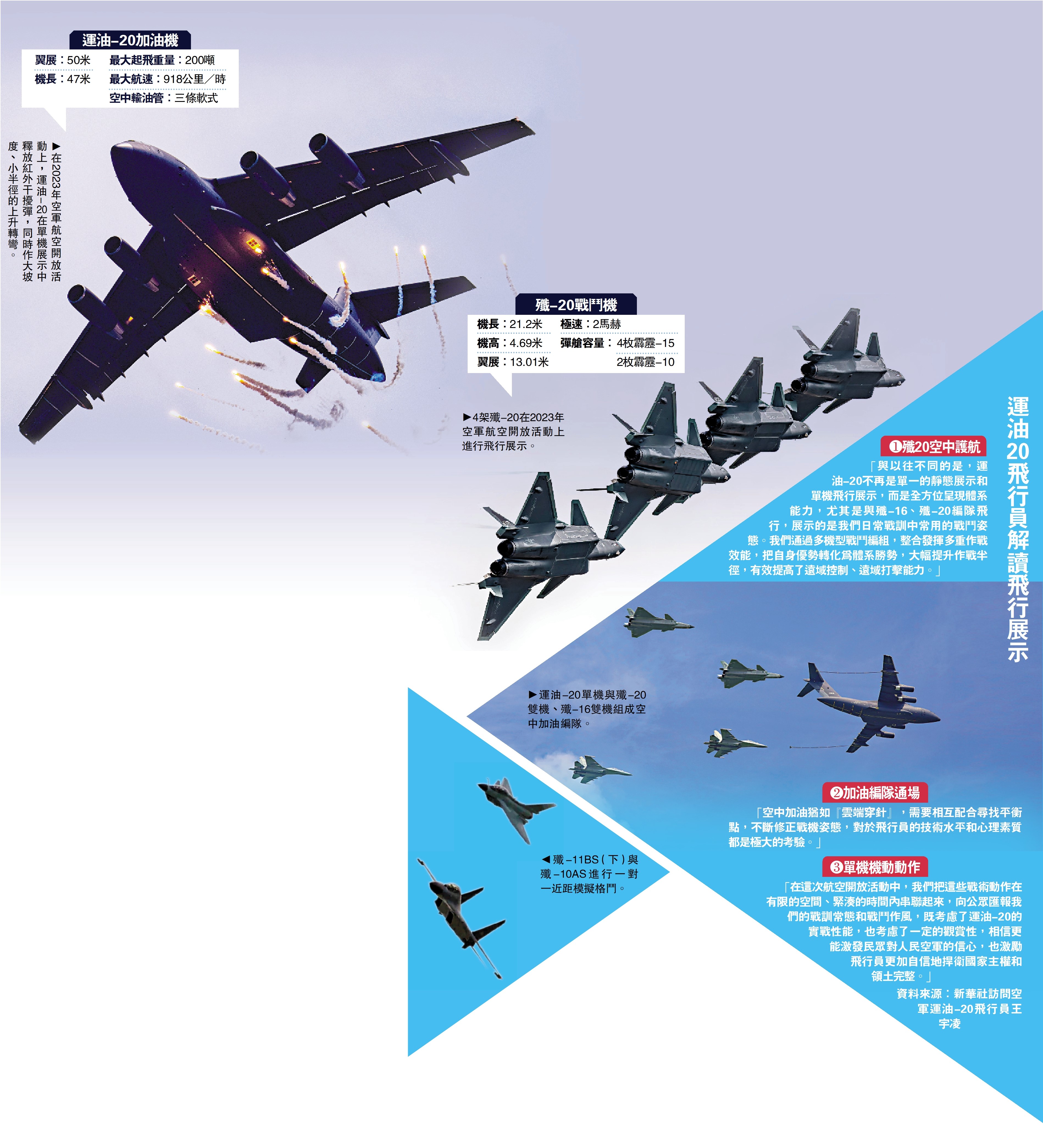 空中加油機可大幅增加戰機的航程和滯空時間,提高空中力量遠程機動能力,是空戰的「力量倍增器」。運油-20是以國產運-20「鯤鵬」遠程重型運輸機為平台改裝的特種機型。2021年11月底,運油-20首次與空警-500、轟-6K、殲-10C等共同參加繞台巡航,其後多次與殲-20、殲-16、殲-10C等殲擊機「三劍客」開展空中加油訓練。