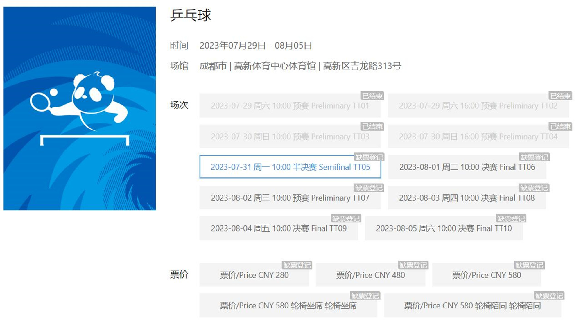 成都大運會比賽設18個大項、269個小項,除田徑項目中20公里競走及半程馬拉松兩個小項外均可購票。自6月16日起,成都大運會門票進行了多輪集中售票,票價共分580元、480元、380元、280元、180元、120元、80元、50元、30元9檔。7月31日上午,記者登錄成都大運會購票官網發現大多數項目顯示「缺票登記」,指「當前頁面顯示的門票已經售賣完畢,用戶可以留下自己的個人信息,待有票時會第一時間通知」。