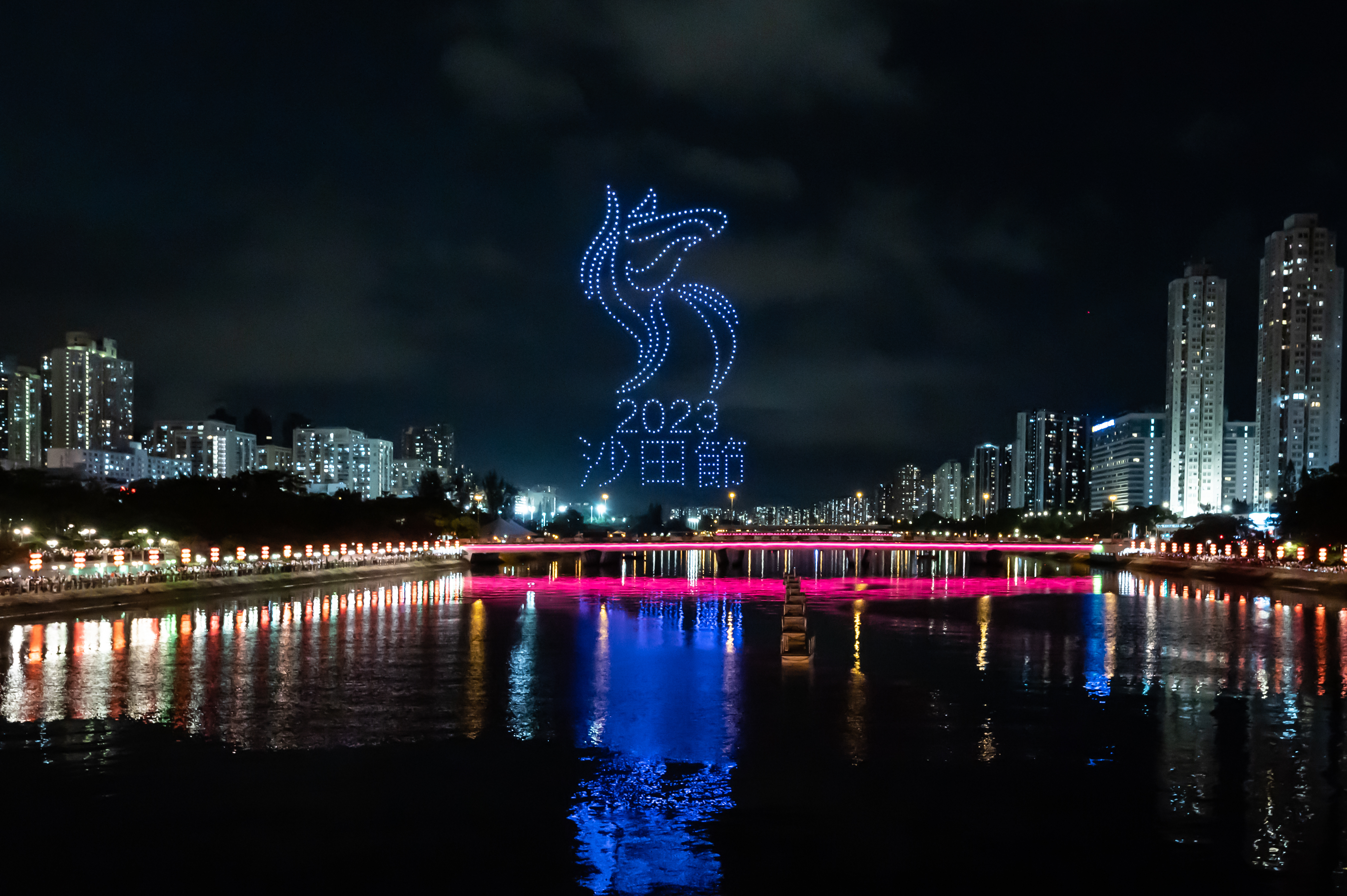 活動期間,沿河兩岸共聚集了超過5000名市民,連同沙田市中心一帶在家觀賞的3萬多名市民,一同見證500架無人機陣列徐徐升空。機隊首先組合出「2023 沙田節」的標誌,以別開生面的方式慶祝沙田節揭幕,繼而顯示醒目可愛的沙田節吉祥物——馬田(Martin)和今屆沙田節新增的馬天娜(Martina),引領觀眾步入歡樂的童話世界。隨着故事發展,機隊呈現出划艇、車公廟風車,以及龍舟競渡等多個富有沙田特色的形象,其後市民在馬田和馬天娜引領下細看我國五千年偉大文明的萬里長城,以及象徵香港繁榮安定的紫荊花。最後,機隊併合成數十個閃爍優雅的心形圖案和繽紛奪目的「26」圖案,伴隨着悅耳悠揚的古典音樂及「歌唱祖國」樂曲。