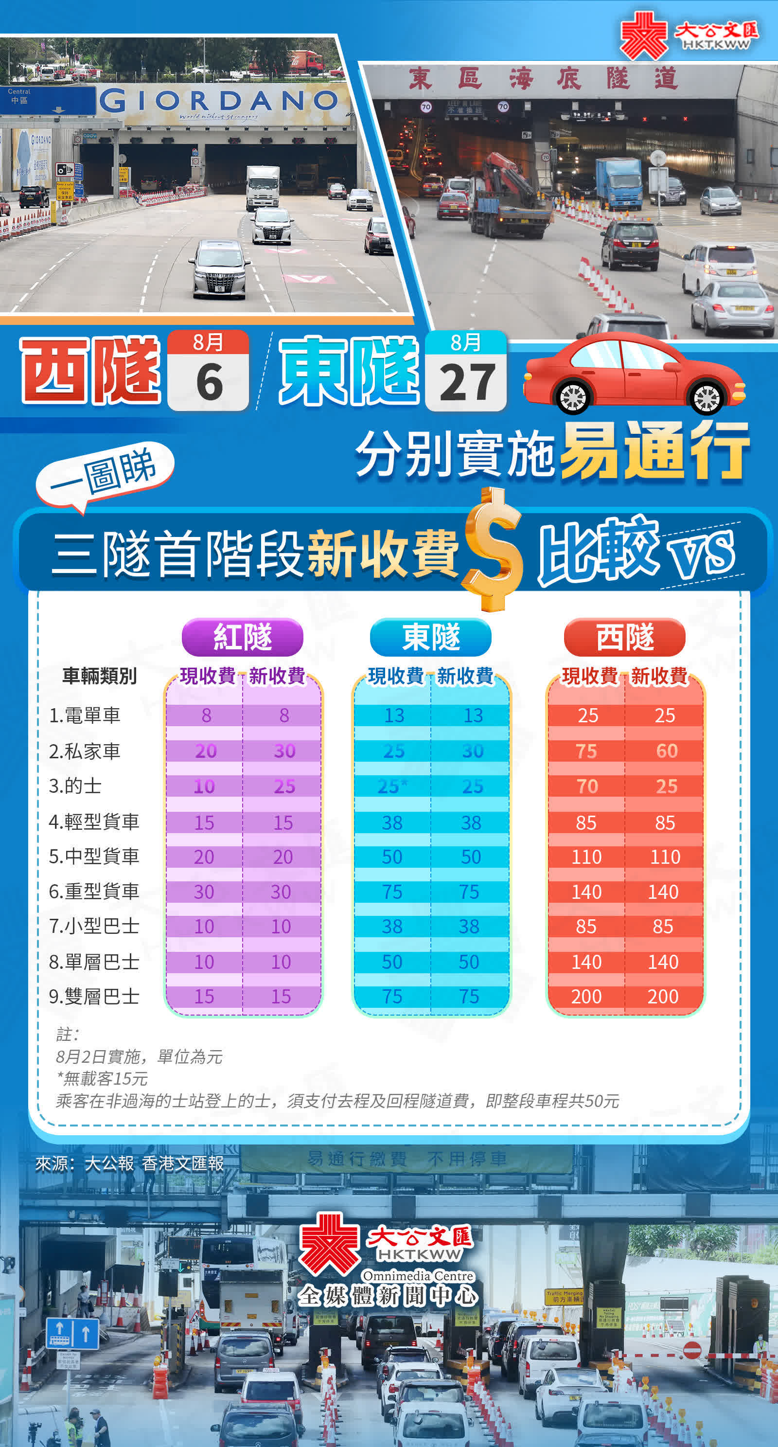 大公文匯全媒體報道,運輸署今日(31日)舉行簡報會,運輸署署長羅淑佩表示,8月2日政府接收西區海底隧道(西隧)時在三條過海隧道實施「633」固定收費方案,以及西隧8月6日上午5時起實施「易通行」。