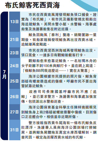 海洋公園昨晚舉行記者會表示,對比上次觀察,鯨魚背部正中位置出現第三個新傷口,大小仍有待量度,相信鯨魚是最近才死亡,脂肪組織經傷口溢出海面。海洋公園指出目前仍在解剖及調查死因,對事件感到可惜,又指這是一個好機會讓市民反思,如何與大自然的不同物種相處。至於第三個新傷口是否與觀鯨活動有關,亦有待進一步調查。該條命喪西貢水域的布氏鯨身長約7米,較成年布氏鯨12米至17米細小,相信是未成年布氏鯨,對上一次在港發現布氏鯨於2021年,惟該鯨最終於深圳灣擱淺。