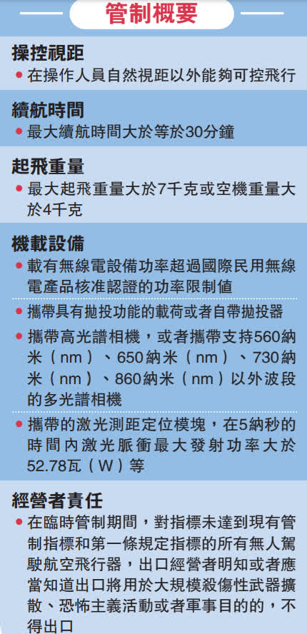 大公報綜合新華社、中通社、觀察者網、環球時報報道,7月31日,中國商務部、海關總署、國家國防科工局、中央軍委裝備發展部聯合發布了關於無人機出口管制的兩個公告,分別對部分無人機專用發動機、重要載荷、無線電通信設備和民用反無人機系統等實施出口管制,對部分消費級無人機實施為期2年的臨時出口管制,同時,禁止其他未列入管制的所有民用無人機出口用於軍事目的。值得注意的是,最大續航時間大於等於30分鐘、空機重量大於4KG等機款納入監管。上述政策將於9月1日起正式施行。此前,中方已經向有關國家和地區作了通報。