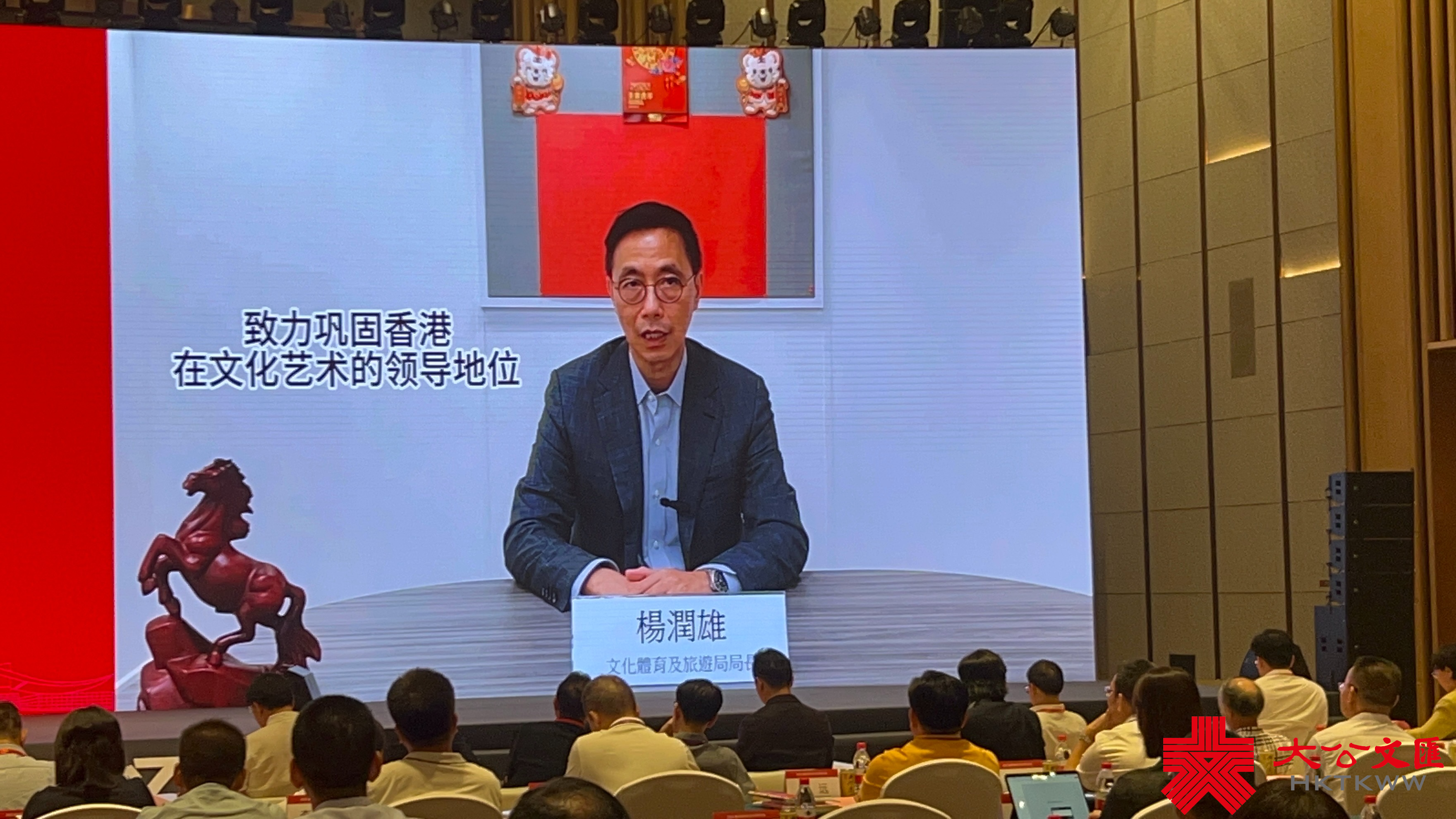 楊潤雄在致辭時表示,粵港澳大灣區的文化藝術內涵既扎根於嶺南文化,但又各有千秋,文化藝術產業創新等方面的交流和合作大有可為。國家在「十四五」規劃綱要中,明確支持香港發展成為中外文化藝術交流中心,特區政府會把握香港中外文化薈萃的獨特優勢,致力鞏固香港在文化藝術的地位。接下來,期待與大灣區內地加強交流與合作,共同推動中國優秀傳統文化傳承、發展和繁榮。