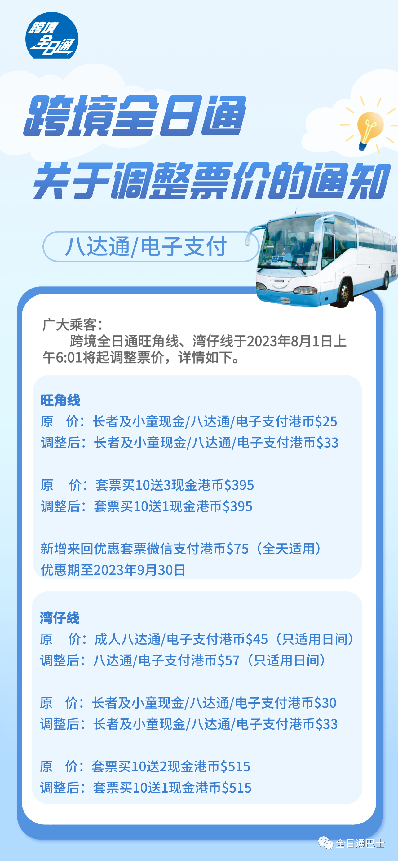 大公文匯全媒體報道,提供24小時香港往返皇崗口岸穿梭巴士服務的全日通巴士今(8月1日)起加價。據「全日通巴士」微信公眾號,自2023年8月1日上午6:01起,全日通巴士旺角線、灣仔線對八達通/電子支付票價有所調整。