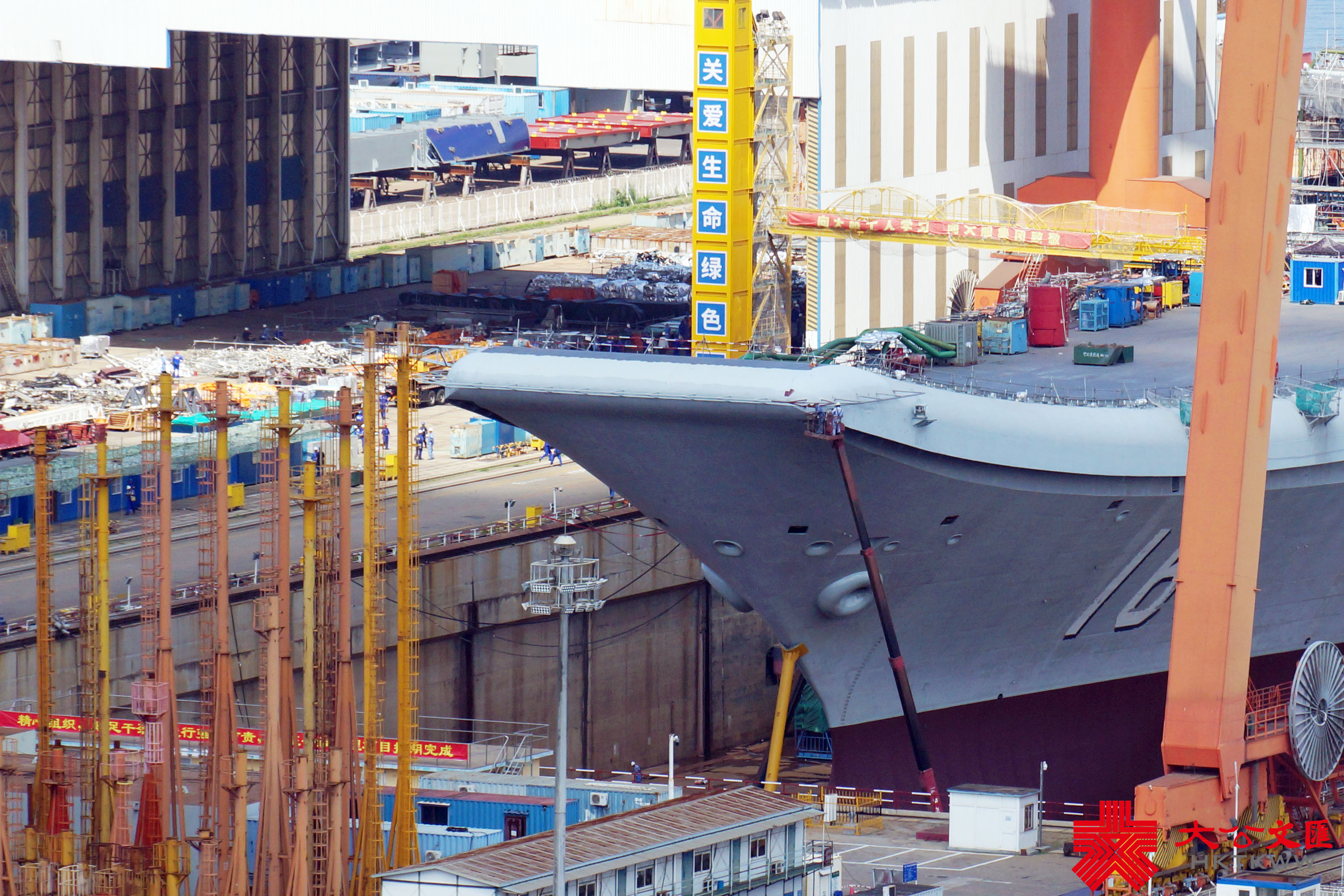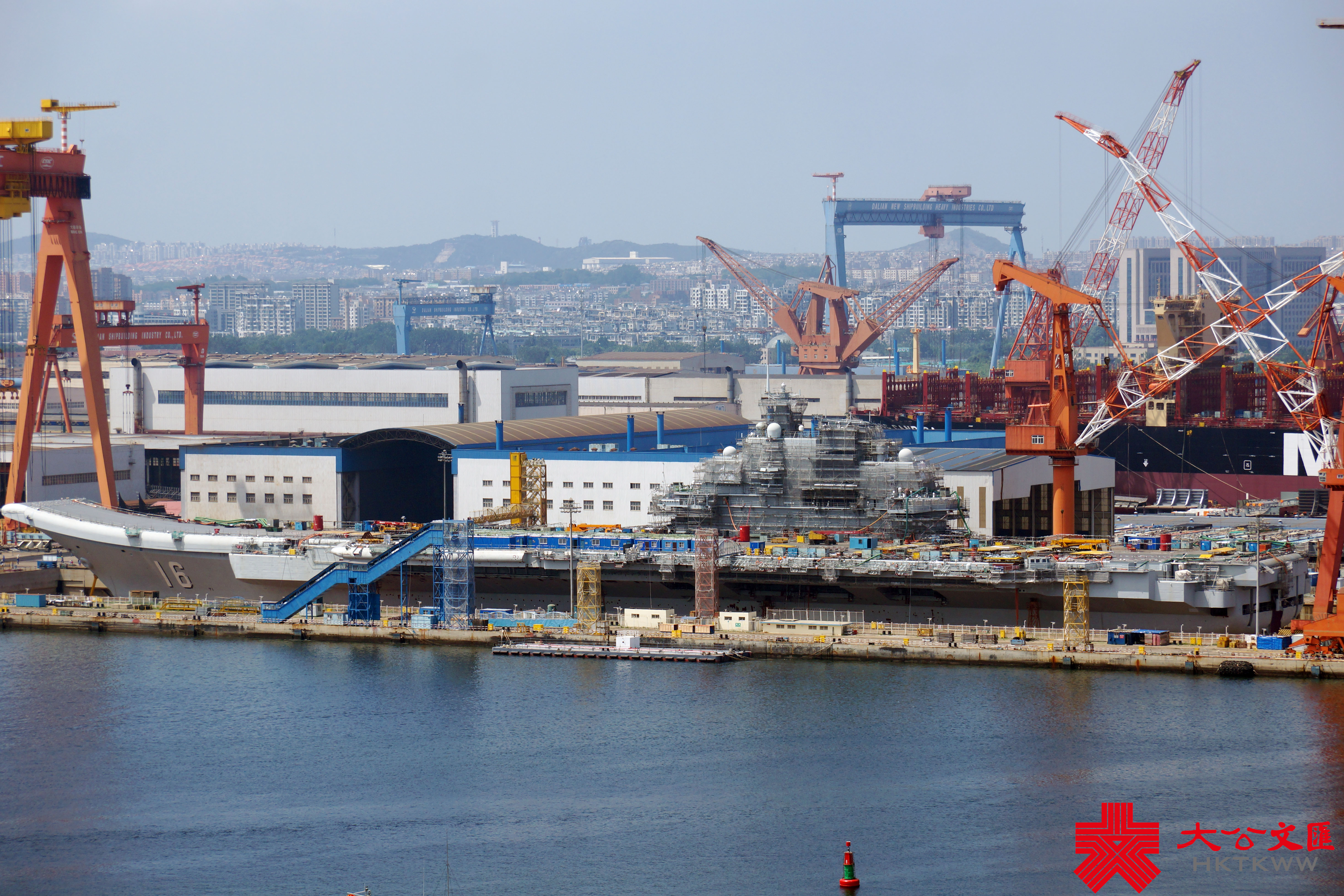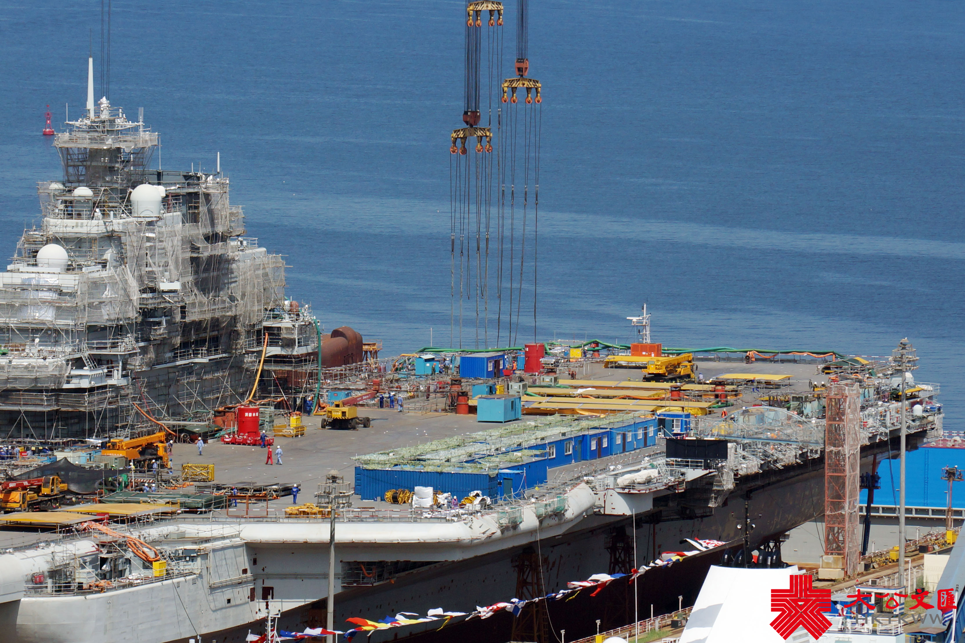 (大公文匯網記者 宋偉)今日(1日)是八一建軍節,中國人民解放軍已走過96年光輝歷程。在大連造船廠,中國首艘航母綜合保障船「向前進一號」(舷號88)懸掛滿旗歡慶建軍節。首艘航母遼寧艦正在塢內升級改造,艦島密布腳手架,甲板遍布重型機械及設備艙箱,碼頭掛出確保遼寧艦項目按期完成標語。今年2月28日,遼寧艦按計劃返回大連造船廠,對主機鍋爐等一系列部件進行維修、保養和升級改造,施工至今已滿5個月。升級改造期間,遼寧艦官兵還緊貼實戰構設場景,開展航空部門2023年度艦用叉車專業技能比武等練兵活動。