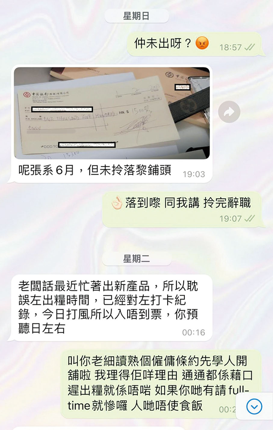 雙方協議每月7日出糧,即6月7日黃小姐理應收到5月份總計4天、共1,000元薪金的支票,然而她未如期收到支票,遂向店長詢問:「為何沒有準時出糧?」店長的回覆卻是「老闆去咗旅行」,更稱其他同事都未準時出糧,之後就着黃小姐放心:「有拖無欠!」