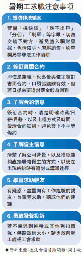 除了拖糧的問題外,周小松提醒學生要格外小心求職騙案,「學生初入社會尤其要留意搵快錢、足不出戶賺錢等高薪利誘,或一些工作內容與報酬不匹配的工作,避免墮入騙案,否則一旦誤墮法網就得不償失,嚴重者恐人財兩失。」他強調,若求職時遇到疑惑,一定要向有經驗的親友長輩求助。