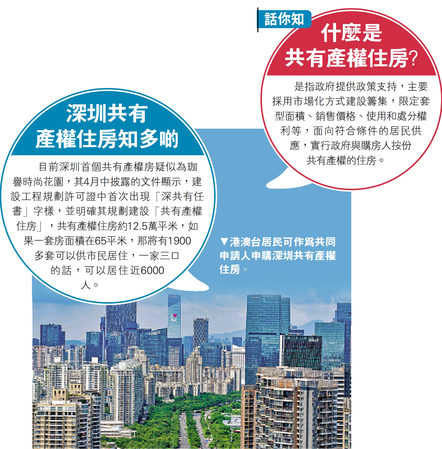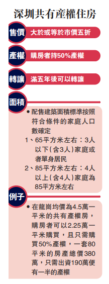 (大公報記者 毛麗娟)深圳市住房和建設局頒布的《深圳市共有產權住房管理辦法》(以下簡稱為《辦法》)於8月1日正式實施。申請人及共同申請人要求均具有深圳市戶籍。《辦法》規定,港澳台居民可作為共同申請人申購深圳共有產權住房,免受戶籍限制。售價原則上高於或等於市場價五折。共有產權住房配售建築面積標準按照符合條件的家庭人口數確定,4人以上(含4人)家庭為85平方米(約915平方呎)左右。
