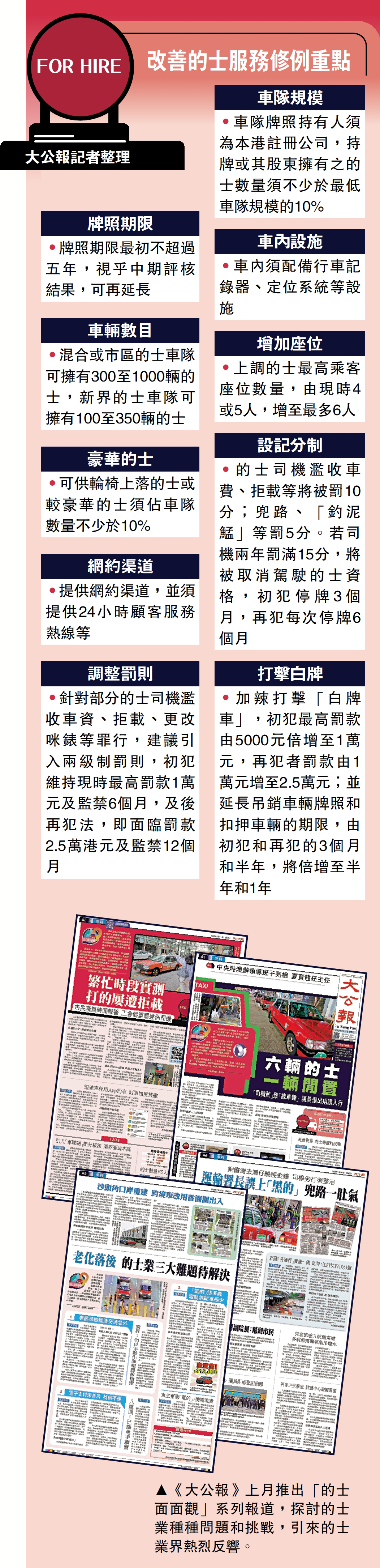 面對的士業各種問題,運輸及物流局早前提出改革方案,當中包括引入「的士車隊制度」等。各界對改革紛紛提出意見,支持車隊制度者認為有助恆常管理,但組成車隊涉及更新,設備、制服、司機培訓等費用,期望政府能提供津貼。運輸及物流局昨日指出,當局設計的士車隊制度時,已考慮業界難處及將會提供適切誘因;運輸署亦指業界大致支持的士車隊制度,會繼續透過不同渠道與業界保持溝通。(文) 許棹傑(視頻)