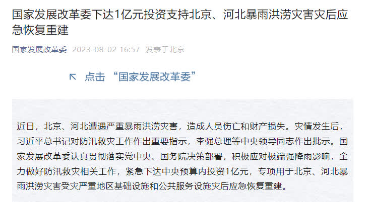 據國家發展改革委微信公眾號今日(2日)消息,近日,北京、河北遭遇嚴重暴雨洪澇災害,造成人員傷亡和財產損失。國家發展改革委認真貫徹落實黨中央、國務院決策部署,積極應對極端強降雨影響,全力做好防汛救災相關工作,緊急下達中央預算內投資1億元(人民幣),專項用於北京、河北暴雨洪澇災害受災嚴重地區基礎設施和公共服務設施災後應急恢復重建。