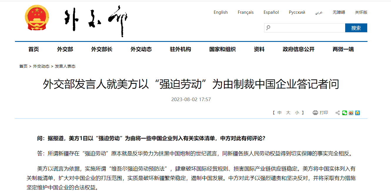 外交部發言人強調,美方以謊言為依據,實施所謂「維吾爾強迫勞動預防法」,肆意破壞國際經貿規則、損害國際產業鏈供應鏈穩定。美方將中國實體列入有關制裁清單,擴大對中國企業的打壓範圍,實質是破壞新疆繁榮穩定,遏制中國發展。中方對此予以強烈譴責和堅決反對,並將採取有力措施堅定維護中國企業的合法權益。