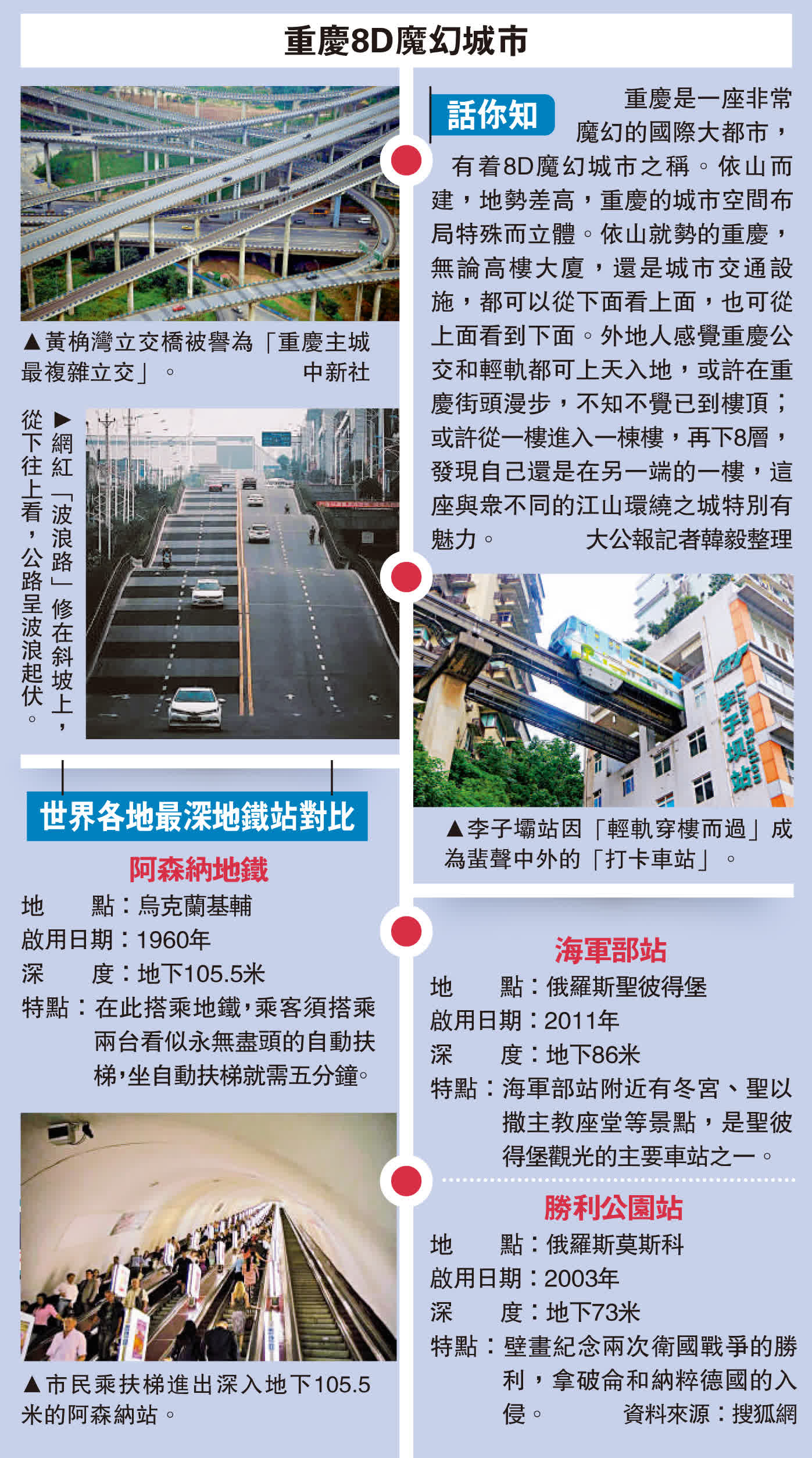 (大公報 記者 韓毅)提及魔幻8D城市重慶,外界熟知地面上的神奇莫過於「輕軌穿樓」──軌道交通2號線李子壩站,而藏於地面下的神奇,就要數全國第一深、世界第二深的軌道交通9號線紅岩村站。依山而建的重慶,地勢差高,地鐵建設亦因其地理特徵影響,造就了深度為116米,相當於39層樓高度的紅岩村地鐵站。所有乘客都能清晰感受到116米的高度─從4號口到站台層,需要連乘8段自動扶梯,耗時約10分鐘才能抵達。