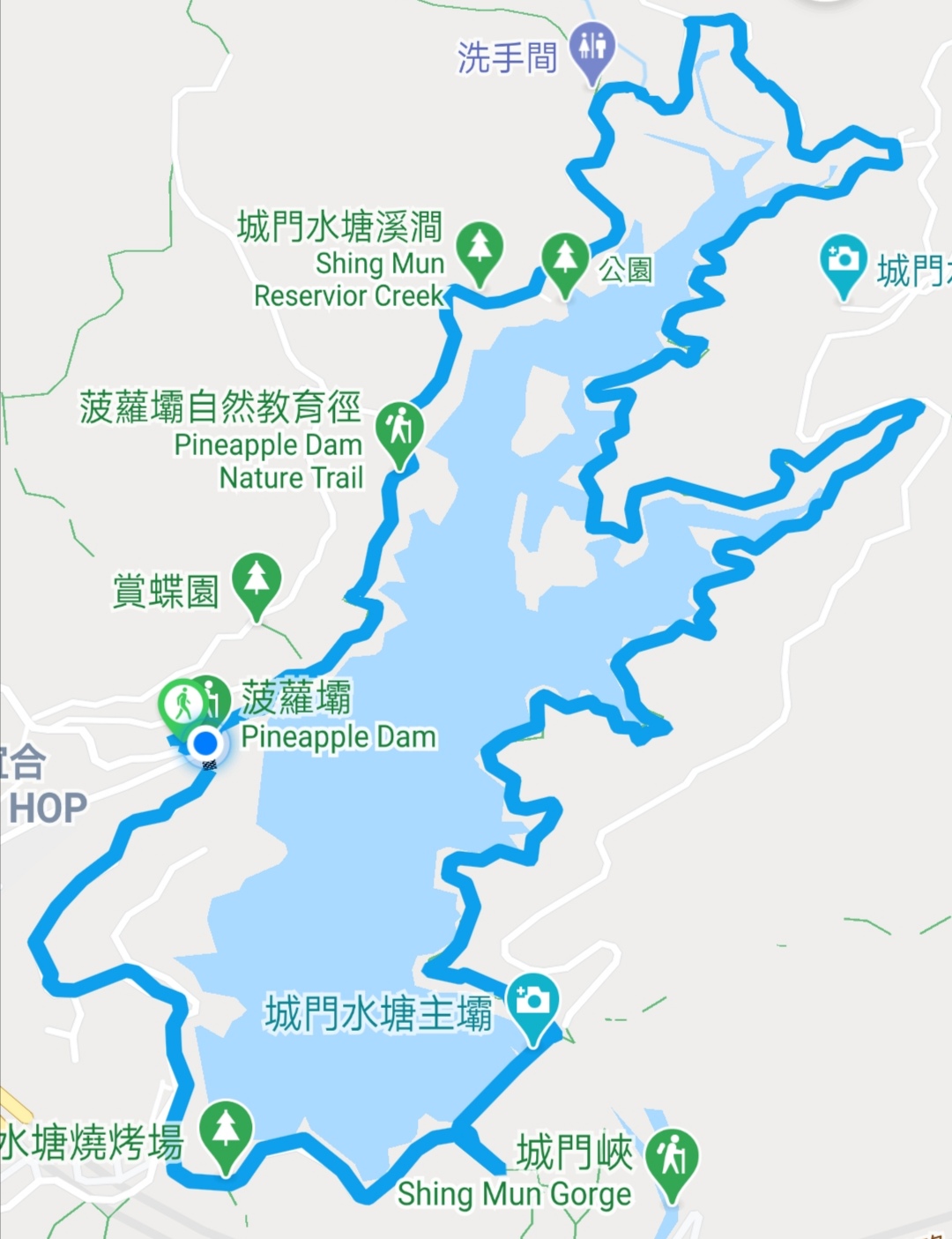 路線:菠蘿壩總站→郊野公園遊客中心→燒烤二號場→水塘溪澗→主壩→城門燒烤區→菠蘿壩總站