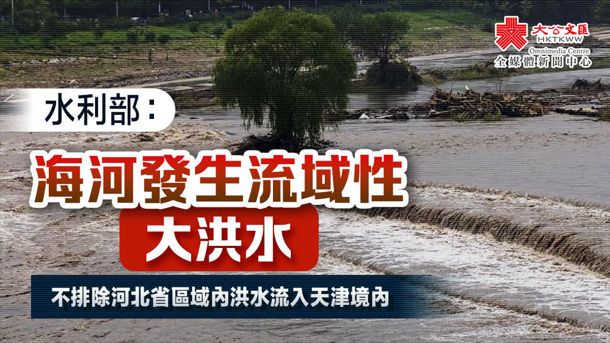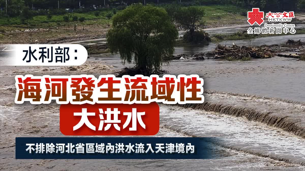 (大公文匯全媒體 記者 張聰 天津報道)根據中國水利官微消息,受7月28日以來強降雨影響,海河流域北三河、永定河、大清河、子牙河、漳衛南運河5大水系有21條河流發生超警以上洪水,其中6條河流超保、8條河流發生有實測資料以來最大洪水。經初步分析,永定河、大清河及子牙河均發生較大及以上洪水,其中大清河和子牙河發生大洪水。依據水利部《全國流域性洪水劃分規定(試行)》,初步判定海河發生流域性大洪水。