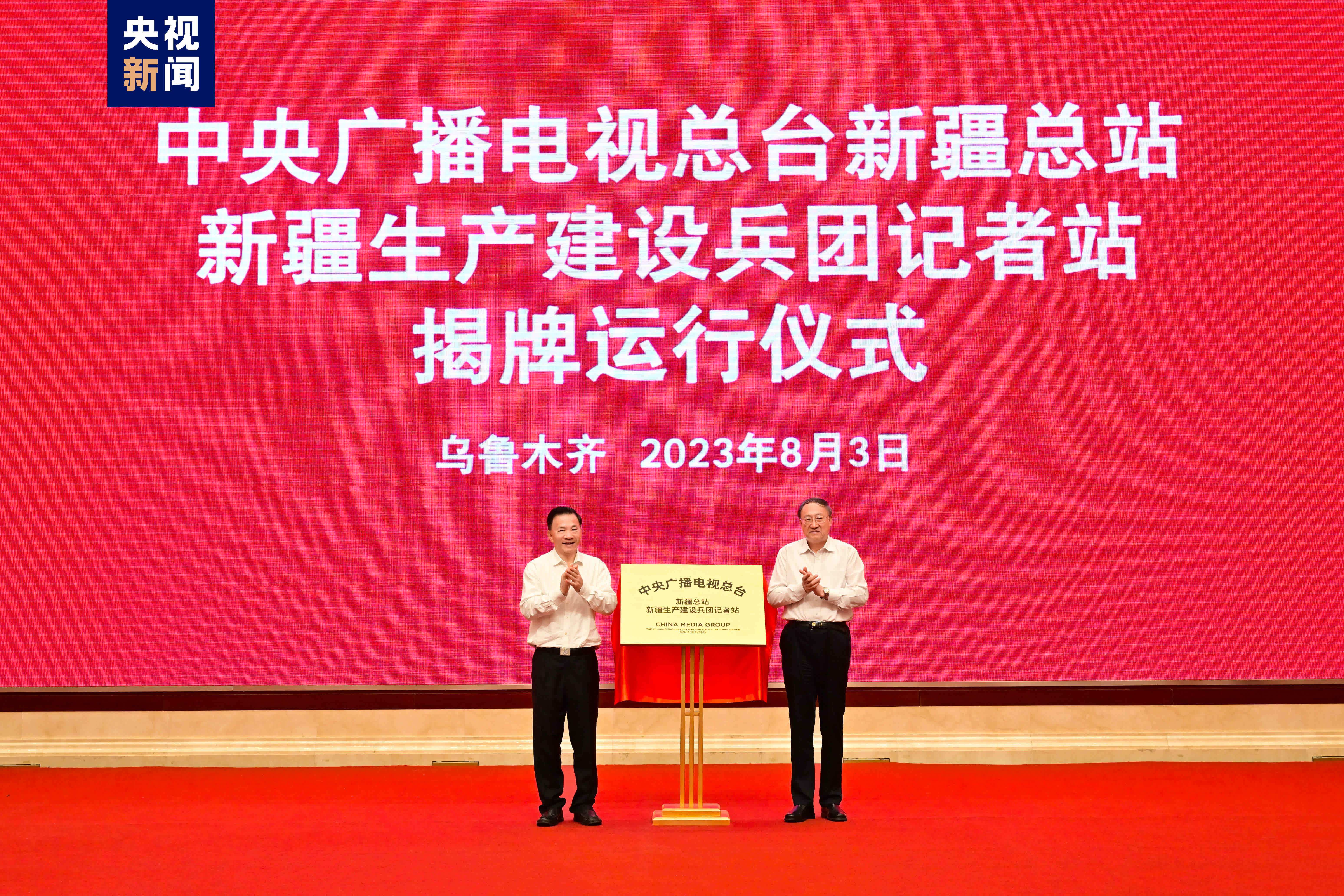 總台新疆總站兵團記者站同時揭牌運行,慎海雄與新疆維吾爾自治區黨委副書記、新疆生產建設兵團黨委書記、政委李邑飛共同揭牌。