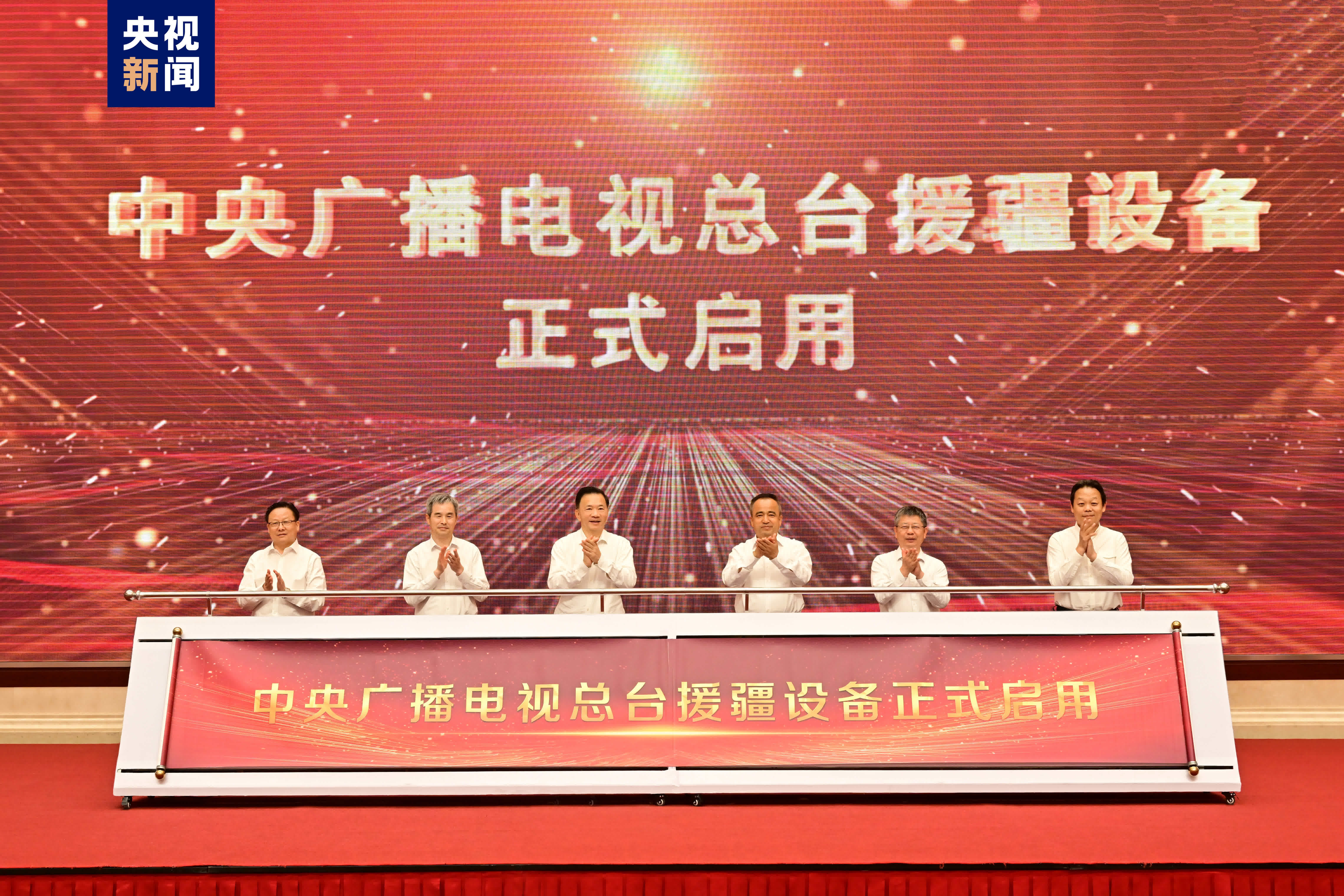 慎海雄、艾爾肯·吐尼亞孜、王建新、姜文波、新疆廣播電視台台長劉春、總台技術局局長徐進共同啟動中央廣播電視總台援疆設備啟用。