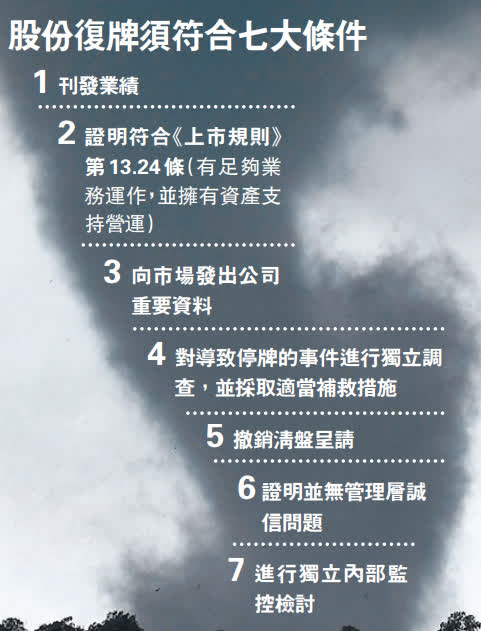 為免除牌,其實多間內房相關股也在努力,好像融創(1918)、佳兆業(1638)、世茂集團(0813),以及物管股彩生活(1778),恒大系的恒大汽車(0708)及恒大物業(6666)等股,都陸續成功復牌。會計界人士稱,其實復牌程序可以在短時間內完成,關鍵是公司與債權人何時達成共識,一旦完成債務重組,並撤銷清盤呈請,基本上已可申請復牌,但根本上要證明有關企業有足夠的經營能力,如果重組過程未完成便到「死線」,也不排除聯交所會作出寬限的可能。
