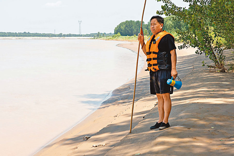 這天,戶外溫度逼近40℃,太陽火辣辣地曬在身上。王和新身着短袖衣衫,只套了一件救生衣,沒有做任何防曬措施。他行走在岸邊的水裏,不斷用木棍試探着水的深度。每年5月到10月,王和新就用這樣的方式「感知」黃河岸邊的陡灘,他都在心裏一一做了標記。有時候為了摸清水勢,他一天在水裏走個三五趟。