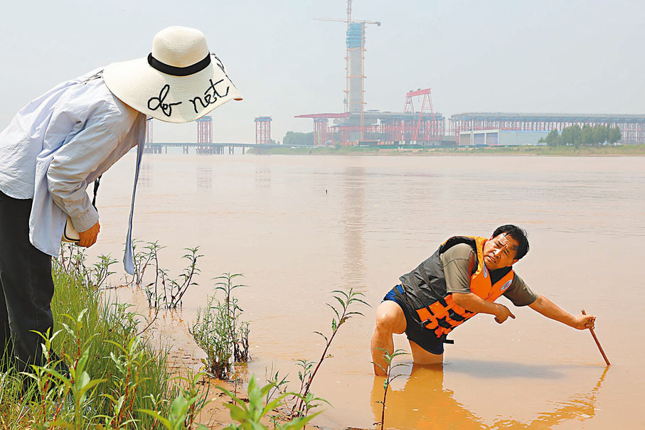 「黃河水流急、陡灘多,溺水難上岸。」王和新形容為「一步生,一步死」。王和新告訴香港文匯報記者,他所在的黃河章丘段屬於黃河下游,章丘段長26.6公里,水面看似平靜,但水下地勢多變,溝壑暗藏。為了讓記者了解水下陡灘的危險,王和新幾次入水測試水深。水流湍急,黃河水裹挾着他而去。他游回來繼續尋找陡灘,再次入水……