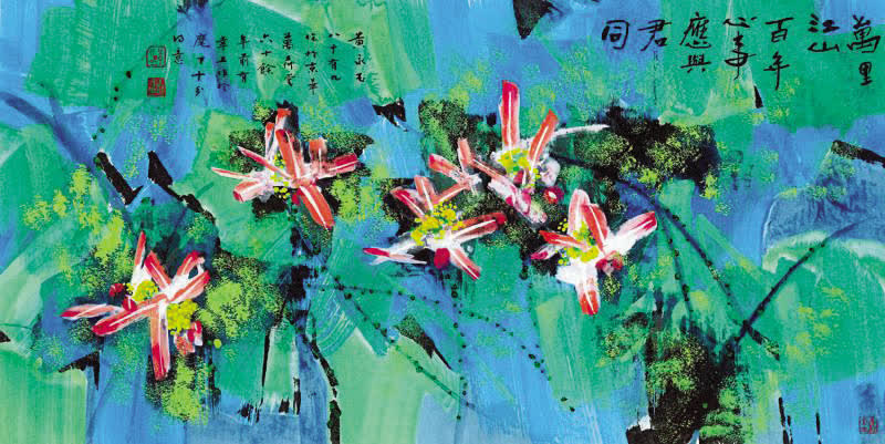 「荷花」是黃永玉的「至愛」,也是他繪畫作品中的一絕。毫無疑問,這幅「彩荷圖」是黃老的精心大作:他以油畫、版畫和插圖的筆法、手法來渲染荷花的神韻,畫中粉荷色調清新嬌艷欲滴,背景色墨晶瑩透亮,水氣瀰漫似雨過荷塘。荷花的千般姿態、萬種風情躍然紙上。