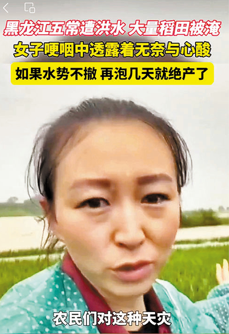 (香港文匯報 記者 于海江)颱風「杜蘇芮」影響持續擴大,黑龍江多地出現強降雨天氣,當地以「五常大米」著稱的哈爾濱五常市多地受災,安家鎮鐵西村民王先生種了近百畝五常稻花香,到4日上午,已經近一半左右被淹沒。「水稻正是孕穗、揚花期,不能淹水。」王先生說,「如果現提前點或者再過幾天到了灌漿期,淹水問題都不大。但是這個時候被淹,結果就是會絕產。」