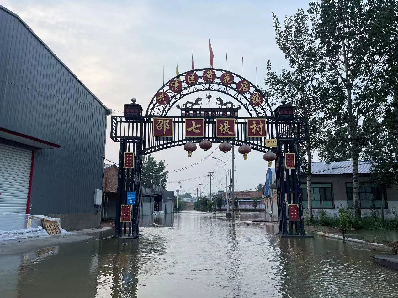 從8月3日12時開始,永定河洪水經上游灘地進入天津市武清區邵七堤村,這也是武清區第一個進洪水的村莊。村子共有常住居民240戶,共626人,早在7月31日晚上,村民就已全部撤離,隨後,村子正式封閉,所有入村道路均實行了硬隔離,並有專人進行值守。目前,整條入村道路已經完全被洪水覆蓋,但尚未進入村民的房子和院子。