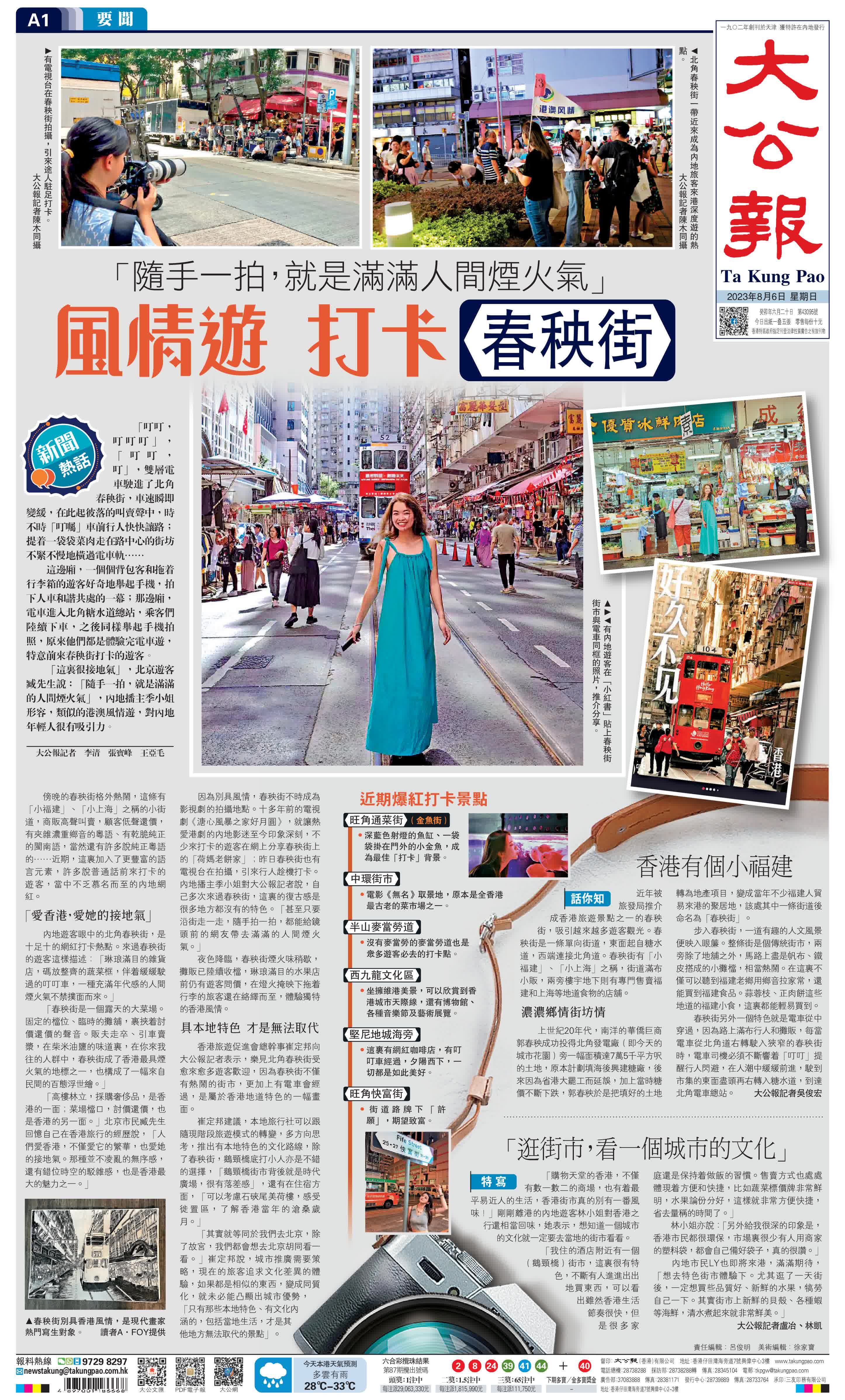 因為別具風情,春秧街不時成為影視劇的拍攝地點。十多年前的電視劇《溏心風暴之家好月圓》,就讓熱愛港劇的內地影迷至今印象深刻,不少來打卡的遊客在網上分享春秧街上的「荷媽老餅家」;昨日春秧街也有電視台在拍攝,引來行人趁機打卡。內地播主季小姐對大公報記者說,自己多次來過春秧街,這裏的復古感是很多地方都沒有的特色。「甚至只要沿街走一走,隨手拍一拍,都能給鏡頭前的網友帶去滿滿的人間煙火氣。」