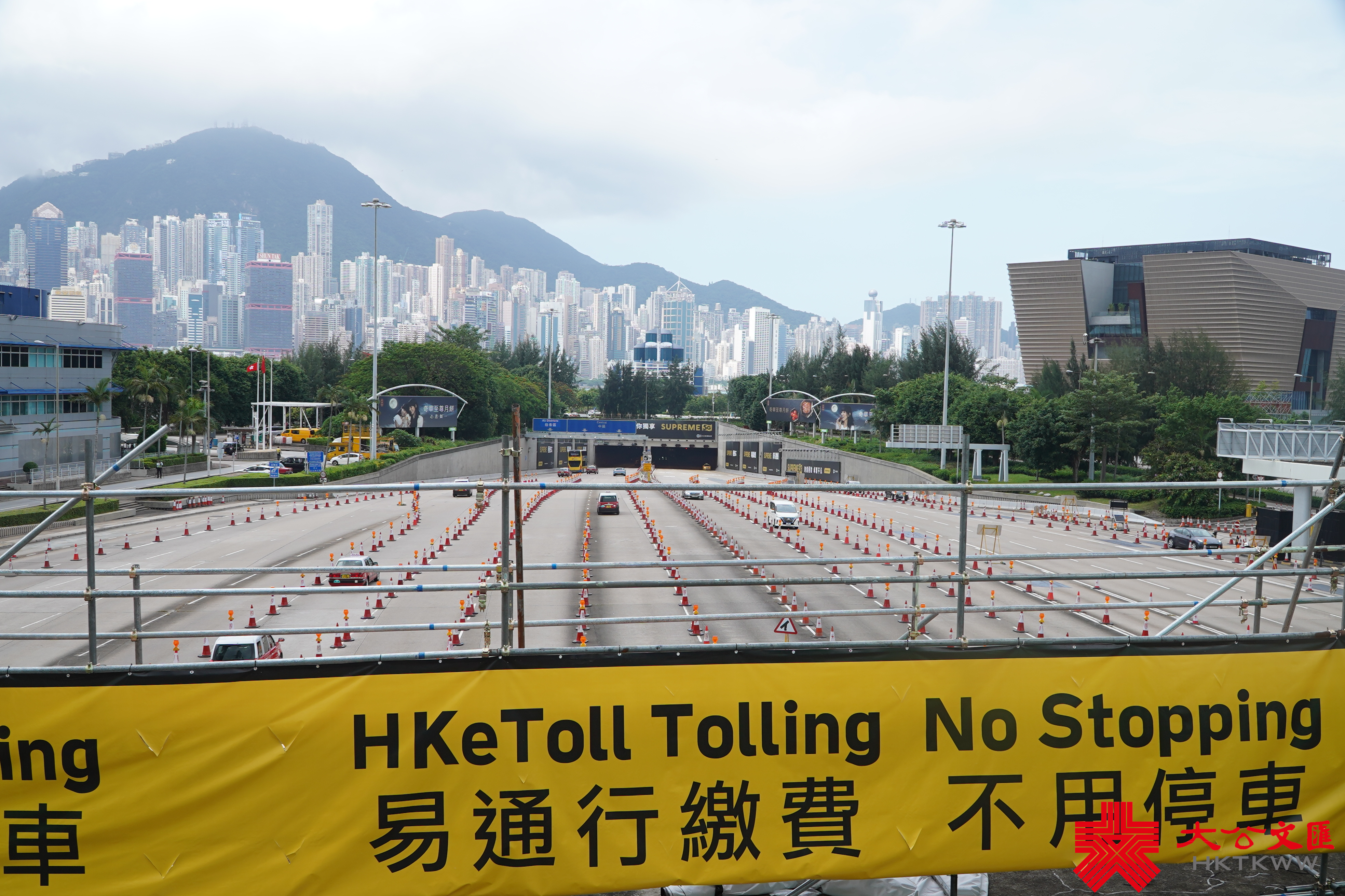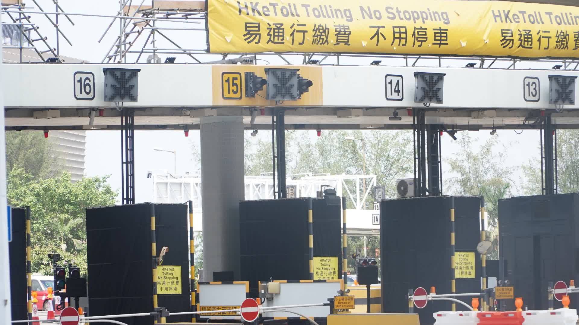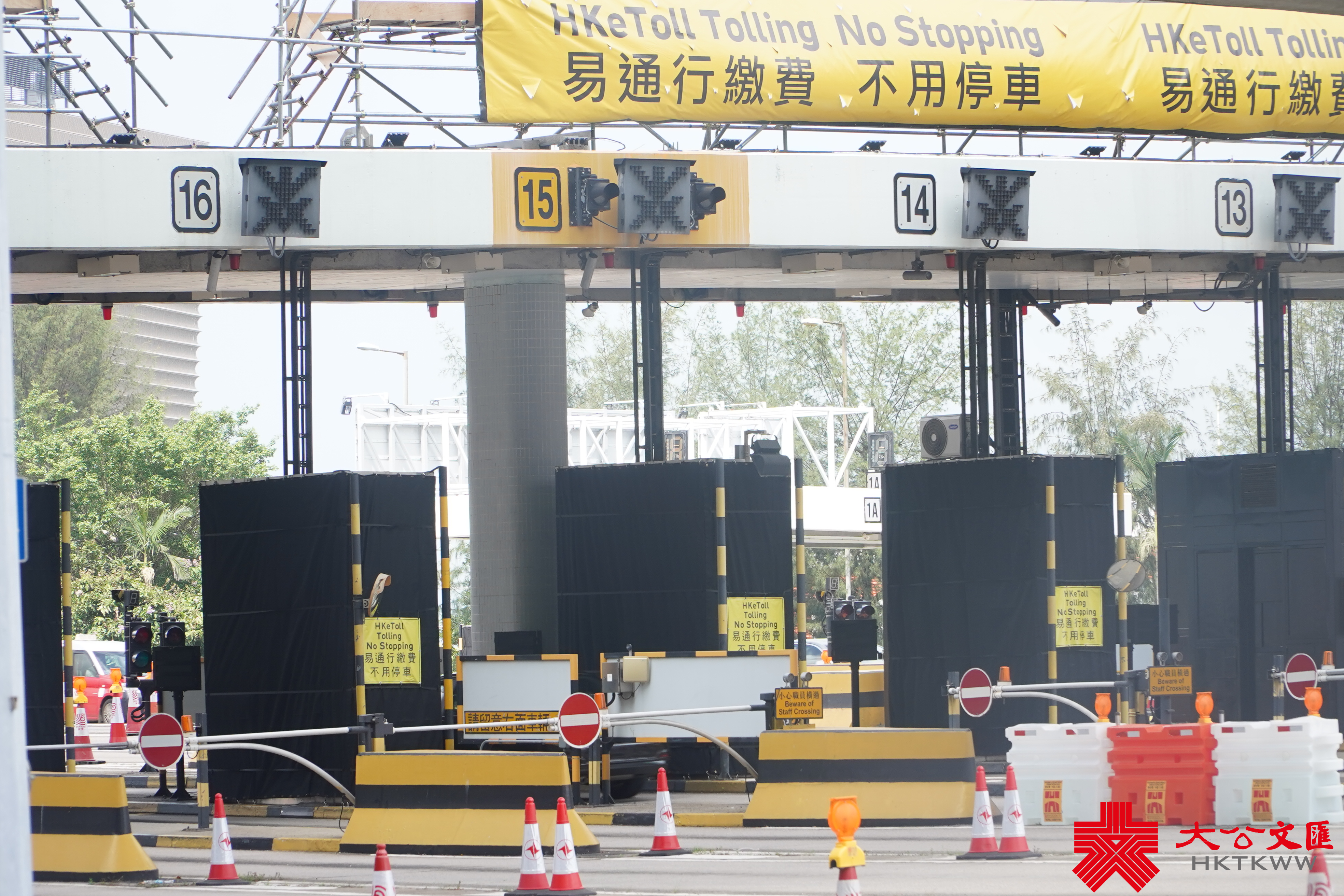 記者見到,收費廣場掛有寫着「易通行繳費 不用停車」的黃色大型指示牌,原來的銀色收費亭已在凌晨進行的改裝工程中被蓋上黑色罩布。