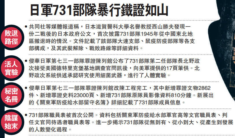 不久前,侵華日軍第七三一部隊罪證陳列館與日本歷史研究學者合作,面向社會公開了一份最新發現的侵華日軍第七三一部隊相關檔案資料──由關東軍司令部於1940年製作的名為《編製(編製修改)詳報》檔案資料,為七三一部隊進行人體實驗、研製細菌武器和實施細菌戰等罪行增添新鐵證,使證據鏈條更加完備。