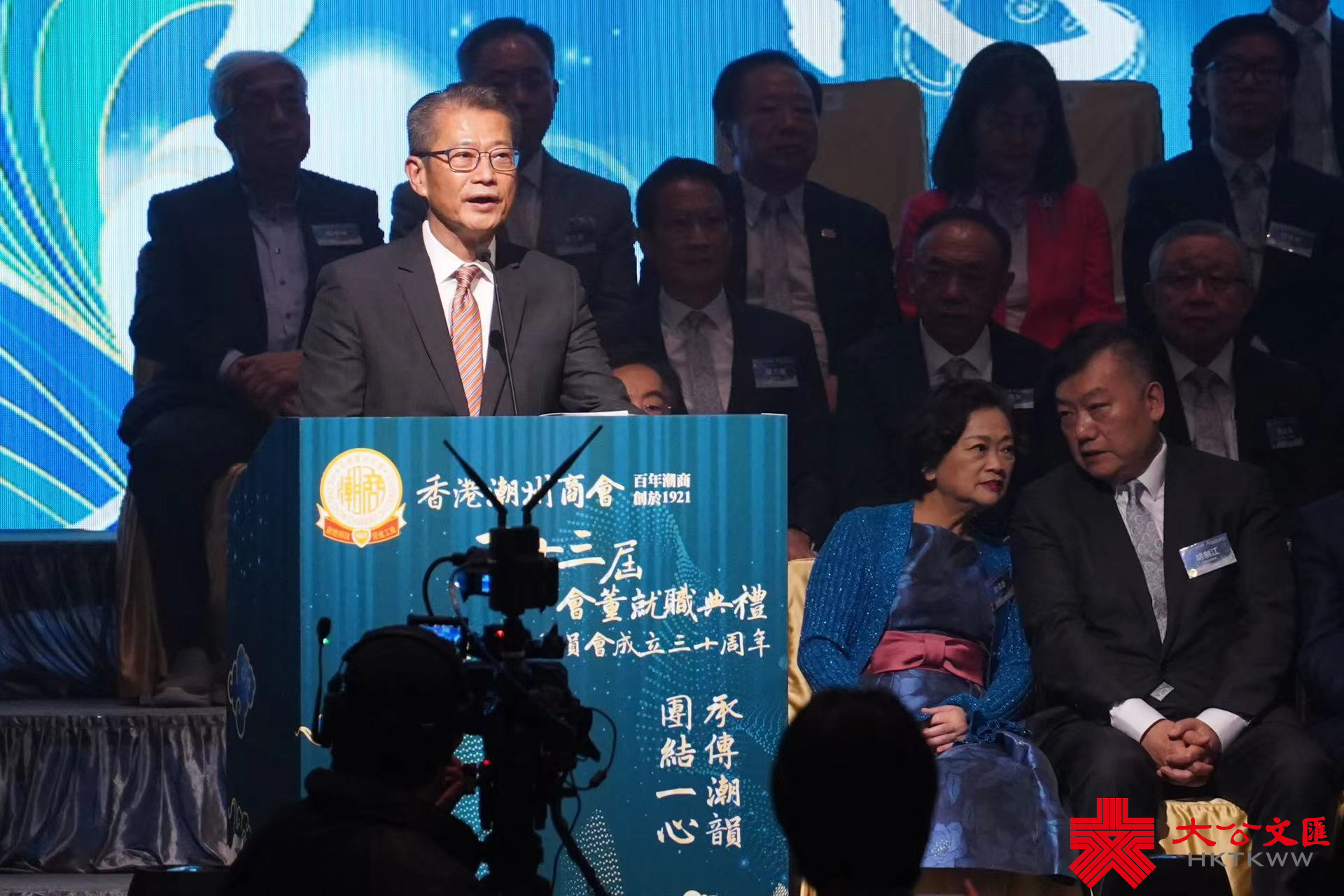 財政司司長陳茂波致辭時用潮州話說「我是潮州人,大家好」。他指香港與潮州淵源深厚,經貿、文化關係密切,血緣相親,潮州人很早在香港發展,在這裏落地生根,開枝散葉,多年來在各行各業取得傑出成就,推動香港經濟發展,並且在各自的崗位上盡心盡力建設社會。目前居住在香港的潮籍鄉親有100多萬人,是香港社會重要的一個建設力量。潮州人一直以勤奮拚搏,善於經營,團結齊心著稱,自從國家改革開放以來,港商到潮州的投資越來越多,是潮州市最重要的外資來源地。