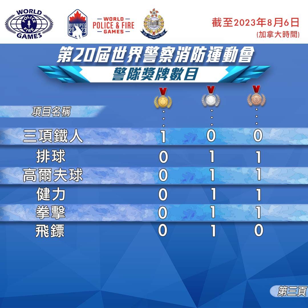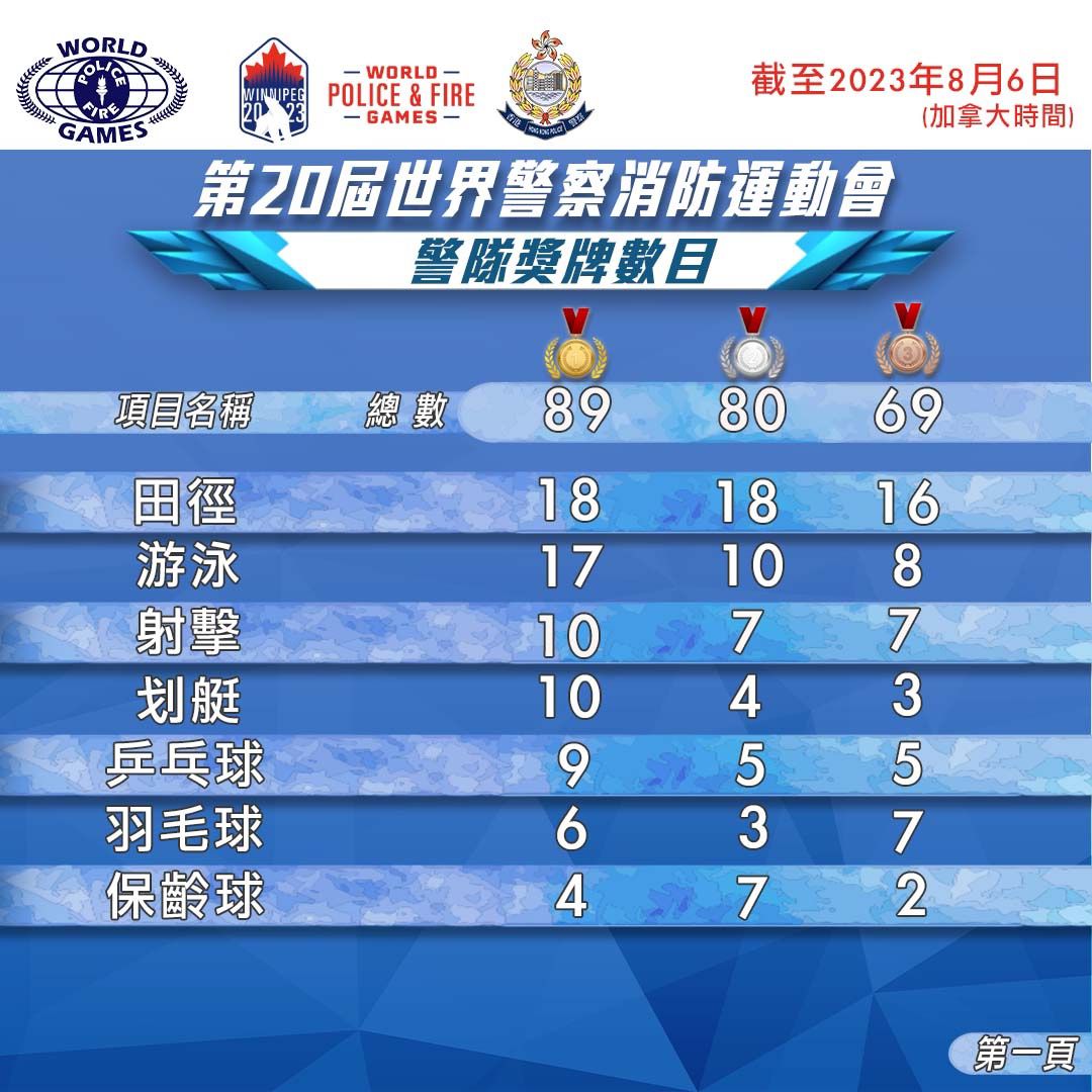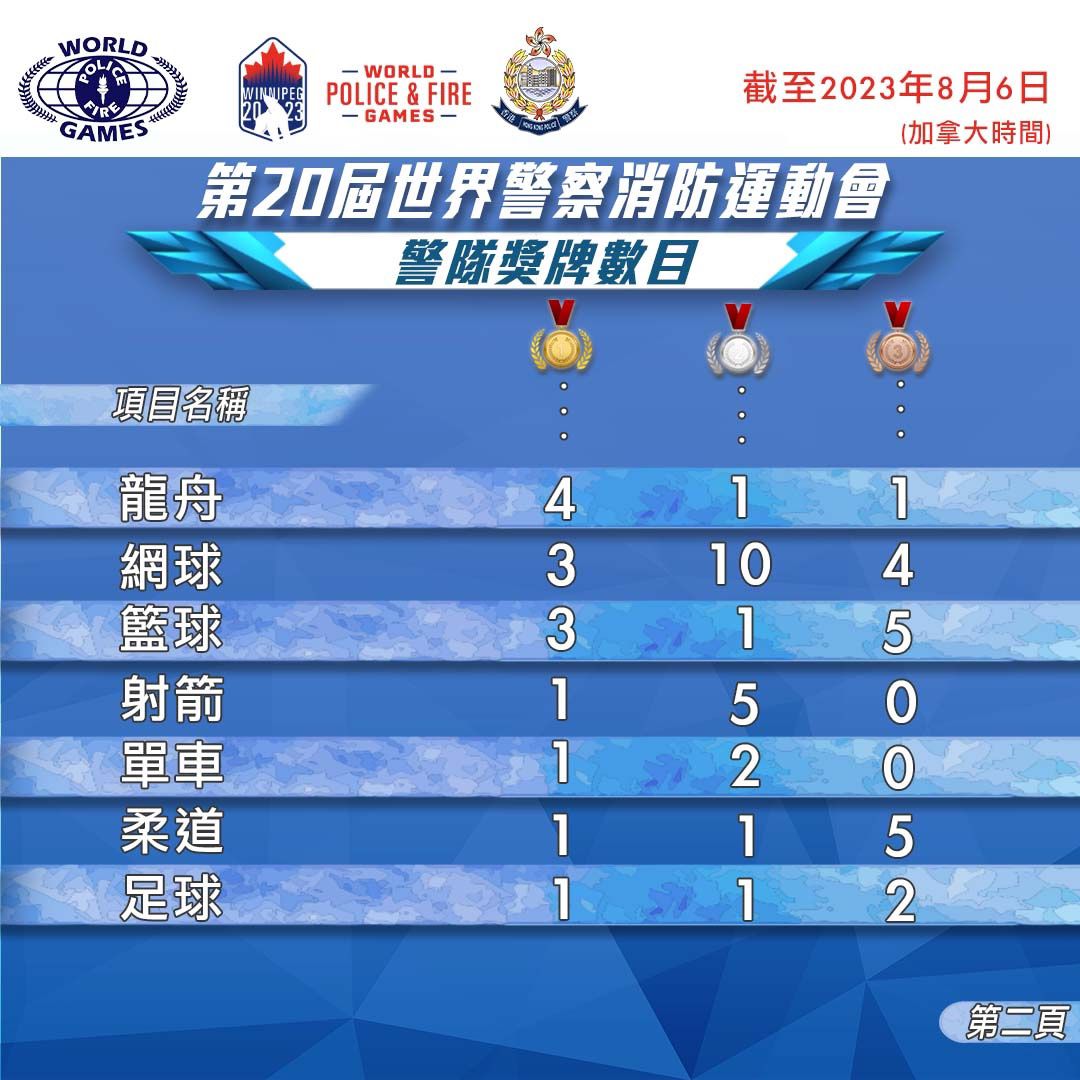 大公文匯全媒體報道,在加拿大舉行的第20屆世界警察及消防運動會結束,香港警隊在各項賽事合共取得238面獎牌。警方今日(7日)在社交網頁表示,今年世警會有超過50個地區、約12000名執法人員參與,經過10日賽事,香港警隊取得89面金牌、80面銀牌和69面銅牌,成績是歷屆之冠。