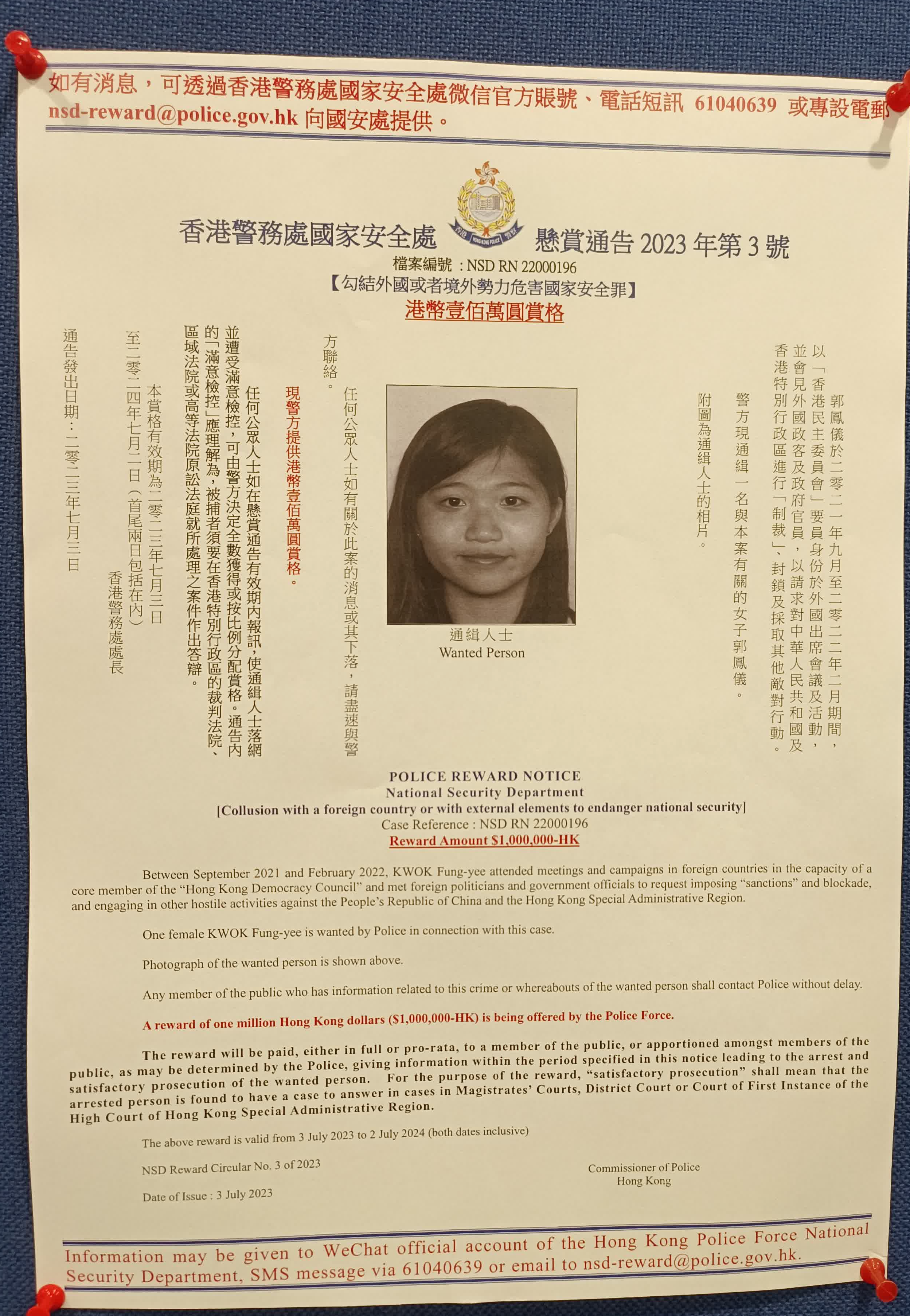 8名涉違國安法竄逃海外的被通緝人士,包括任建峰、袁弓夷、郭鳳儀、郭榮鏗、許智峯、蒙兆達、劉祖廸、羅冠聰。26歲的郭鳳儀,涉嫌勾結外國或境外勢力危害國家安全罪。警方指,涉案人在海外勾結反華組織及政客,以所謂「香港民主委員會執行總監」身份進行相關工作,包括出席外國所謂聽證會,請求外國對中國及香港特別行政區「制裁」或敵對行動,當中包括「制裁」香港法官及檢控官。