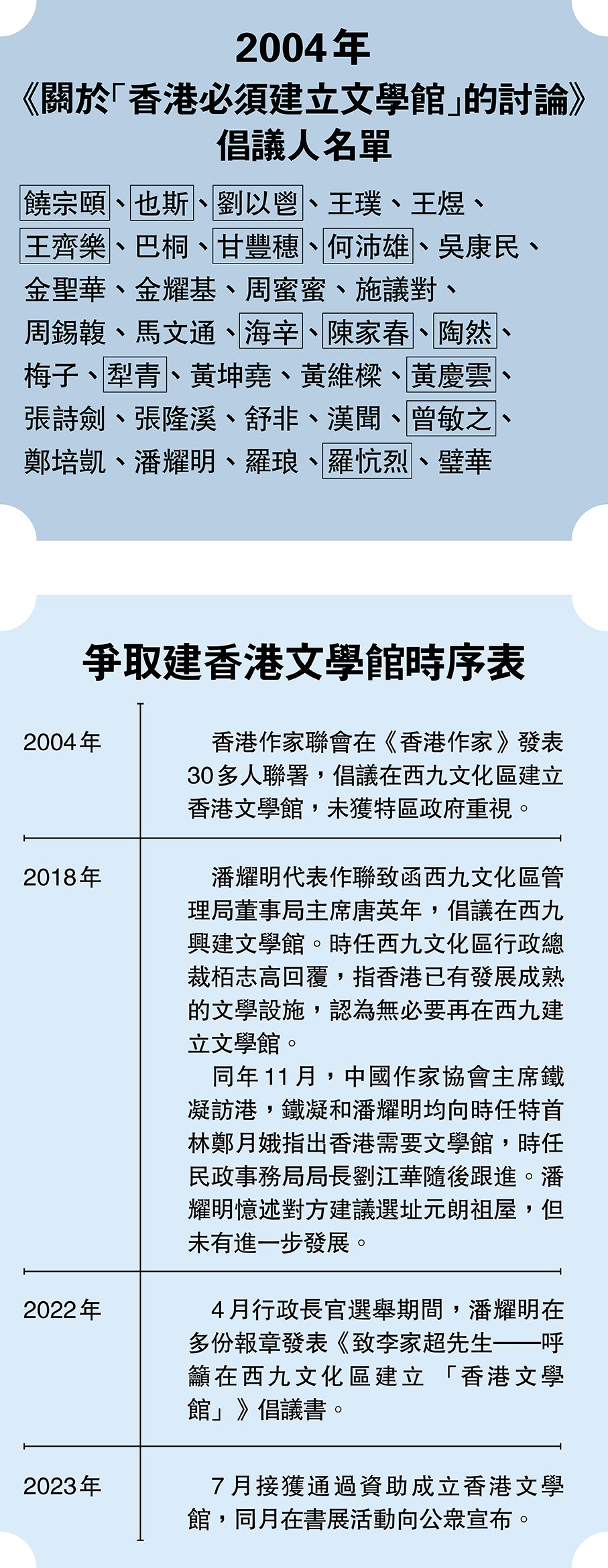 (香港文匯報 記者 黃澄、樊慧杰)2004年第三期《香港作家》雜誌,一篇《關於「香港必須建立文學館」的討論》文章的末尾,列着當時一同發起聯署倡議建立香港文學館的34位文化界人士的名字,這是香港文化界的熱切呼籲。2023年7月香港作家聯會會長潘耀明在他們的會員大會上宣布香港文學館正式籌建,將於明年4月開幕,象徵着歷時19年的爭取終於夙願得償。而當初發起聯署的人士中,有13位已經離世。「這條路走得非常漫長,19年的背後包含了我們對文學的熱忱,以及付出的心血與代價。我很感激這些曾一起發起聯署、並肩爭取的文藝界人士,希望今日這一結果,可以告慰這些已經離世的聯署者。」潘耀明說。