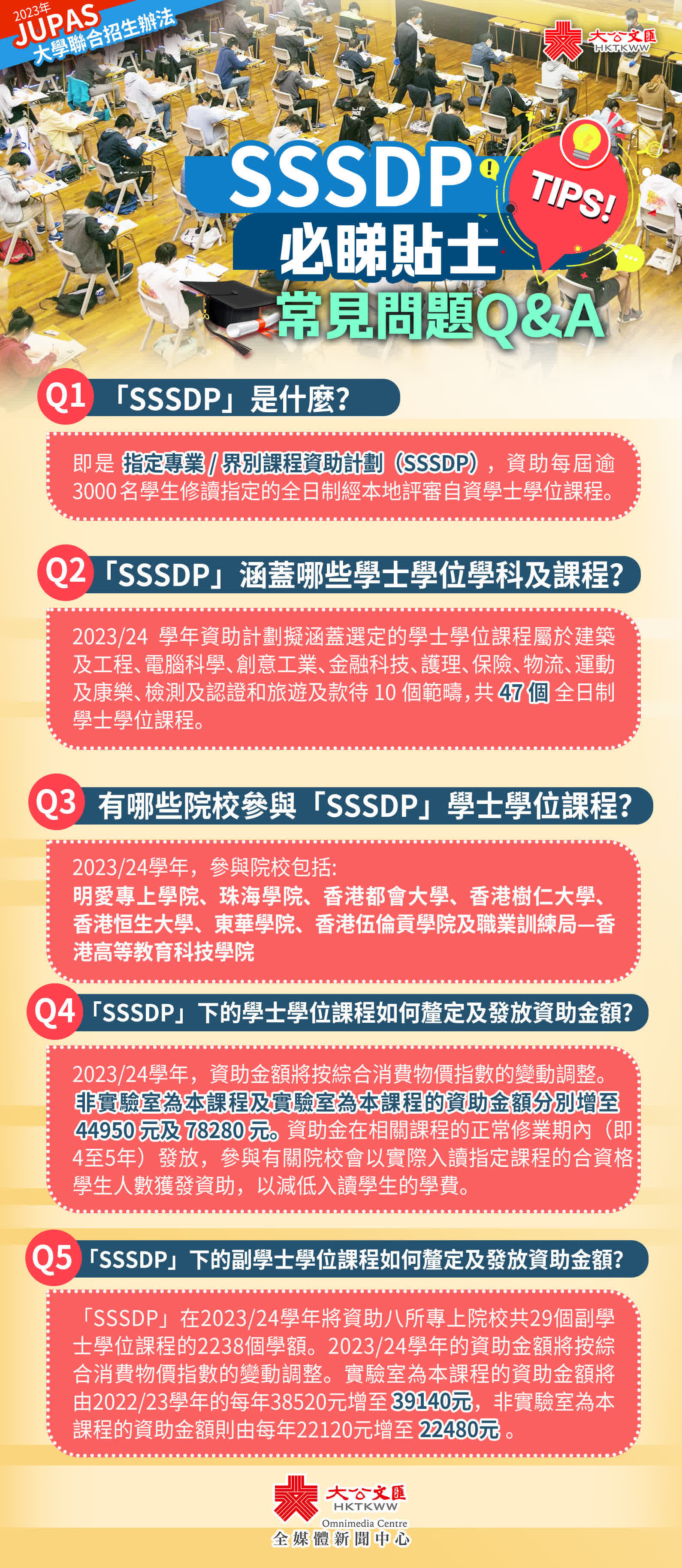 「SSSDP」在2023/24學年將資助八所專上院校共29個副學士學位課程的2238個學額。2023/24學年的資助金額將按綜合消費物價指數的變動調整。實驗室為本課程的資助金額將由2022/23學年的每年38520元增至39140元,非實驗室為本課程的資助金額則由每年22120元增至22480元。