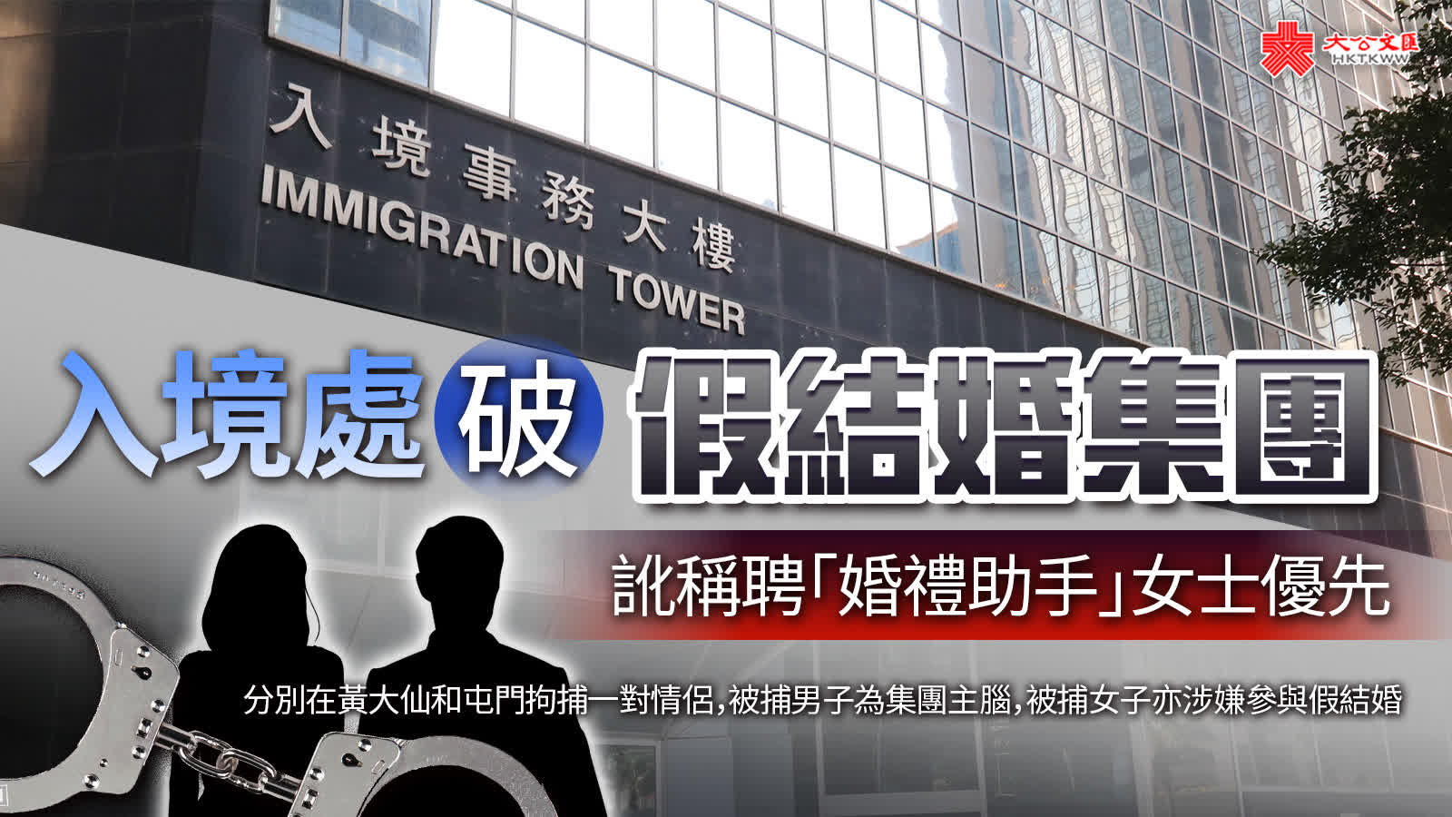 大公文匯全媒體報道,入境事務處搗破一個跨境假結婚犯罪集團,人員今日(9日)早上採取行動,分別在黃大仙和屯門拘捕一對情侶,兩人均為本地人,相信被捕男子為集團主腦,被捕女子亦涉嫌參與假結婚。連同被捕2人在內,同案至今共有49人被捕。
