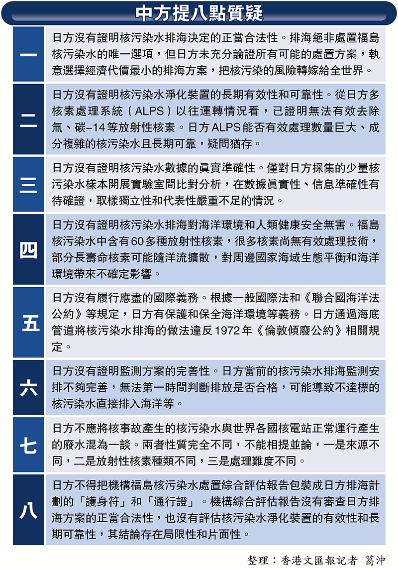 (香港文匯報 記者 葛沖 北京報道)中國常駐維也納聯合國和其他國際組織代表團網站9日發布《中國代表團關於日本福島第一核電站事故核污染水處置問題的工作文件》,這是中方向正在舉行的《不擴散核武器條約》第十一次審議大會第一次籌備會提交的文件。文件中歷數日本在處置福島核污染水過程中存在的不正當、不合法、不負責、不可靠、不完善等八點問題(見表),並提出中方主張,呼籲日本停止強推核污染水排海計劃,確保核污染水得到科學、安全、透明的處置,並接受嚴格國際監督。