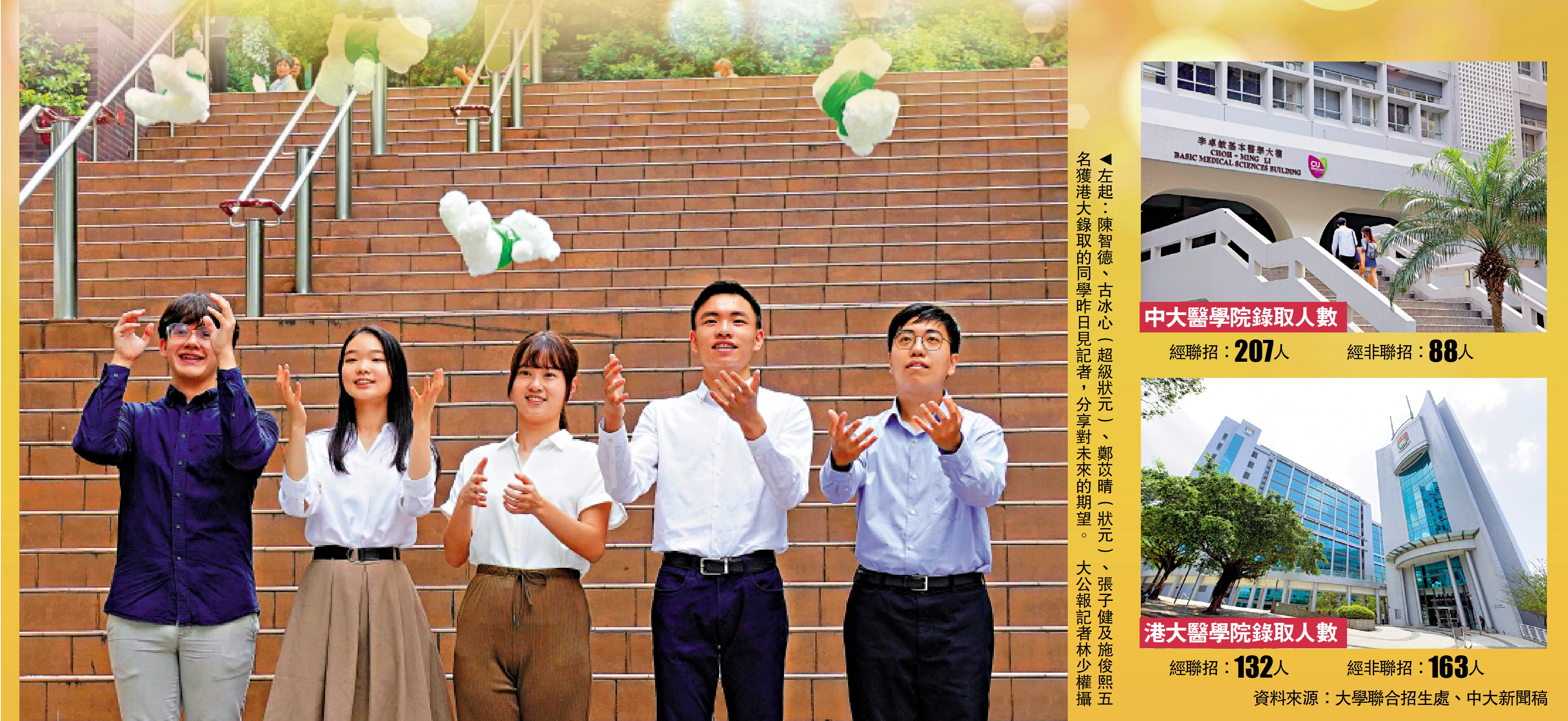 全港經聯招入讀醫科的339名考生中,入讀中大的學生佔六成。港大除攬得兩名「狀元」外,錄取超過四成全港成績Top 1%考生,港大表示對收生結果滿意。