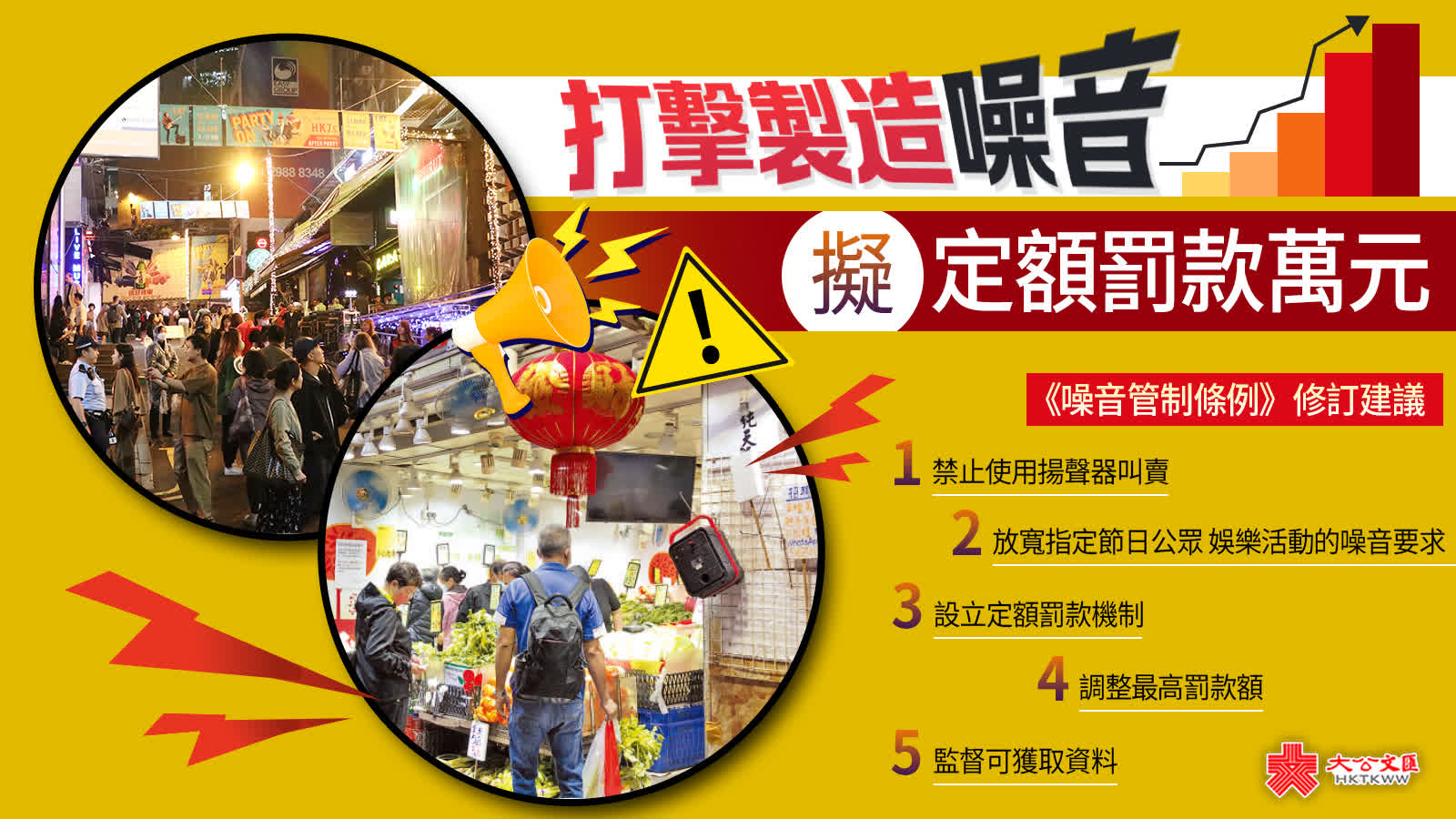 (大公報 記者 伍軒沛)噪音問題困擾不少市民,環境保護署建議修訂《噪音管制條例》,包括禁止店舖或商販,於公眾地方或附近範圍使用揚聲器進行叫賣,又計劃就來自住用處所和公眾地方的噪音問題,引入定額一萬元的罰款機制。修訂亦建議放寬在公眾地方慶祝節日時的噪音規限,容許在中秋節、萬聖節、平安夜、除夕等十個節日,由慶祝活動產生的噪音可延長至翌日凌晨一時。